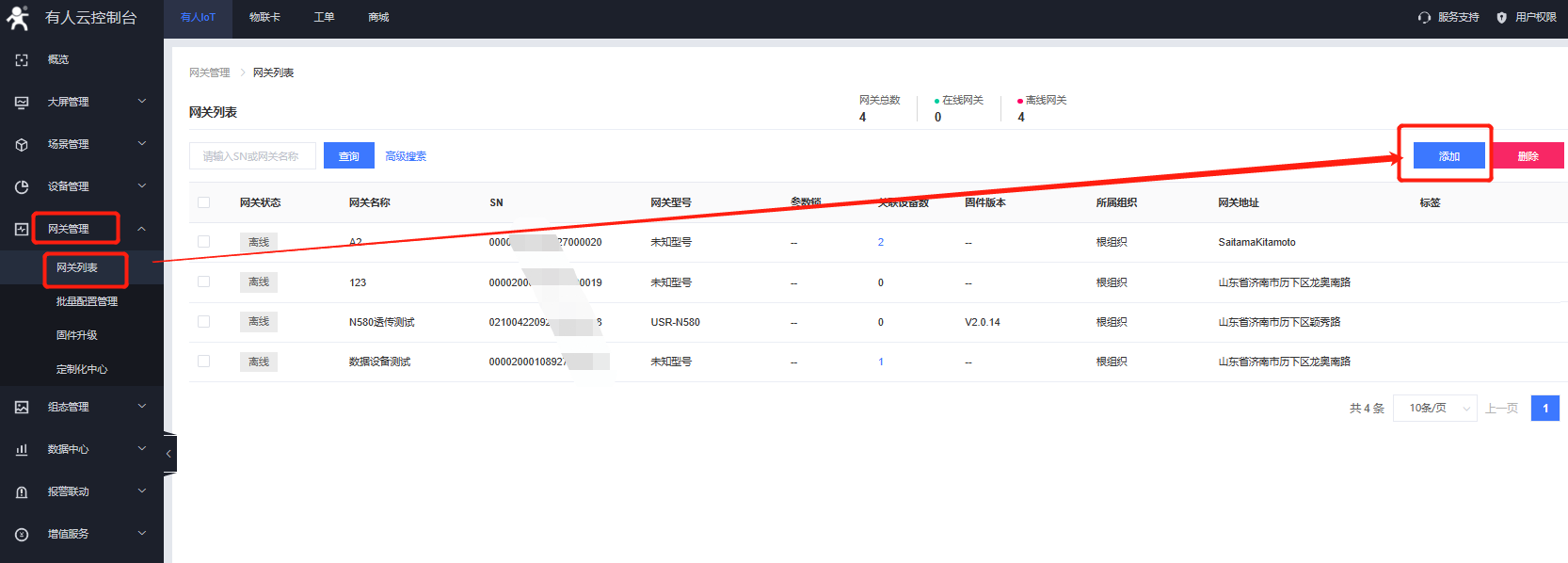 5、點擊網關管理----網關列表----添加網關,選擇網關所屬組織,輸入N5X0的SN和MAC信息,點擊保存。