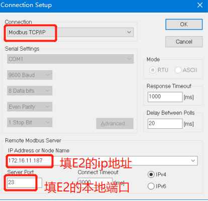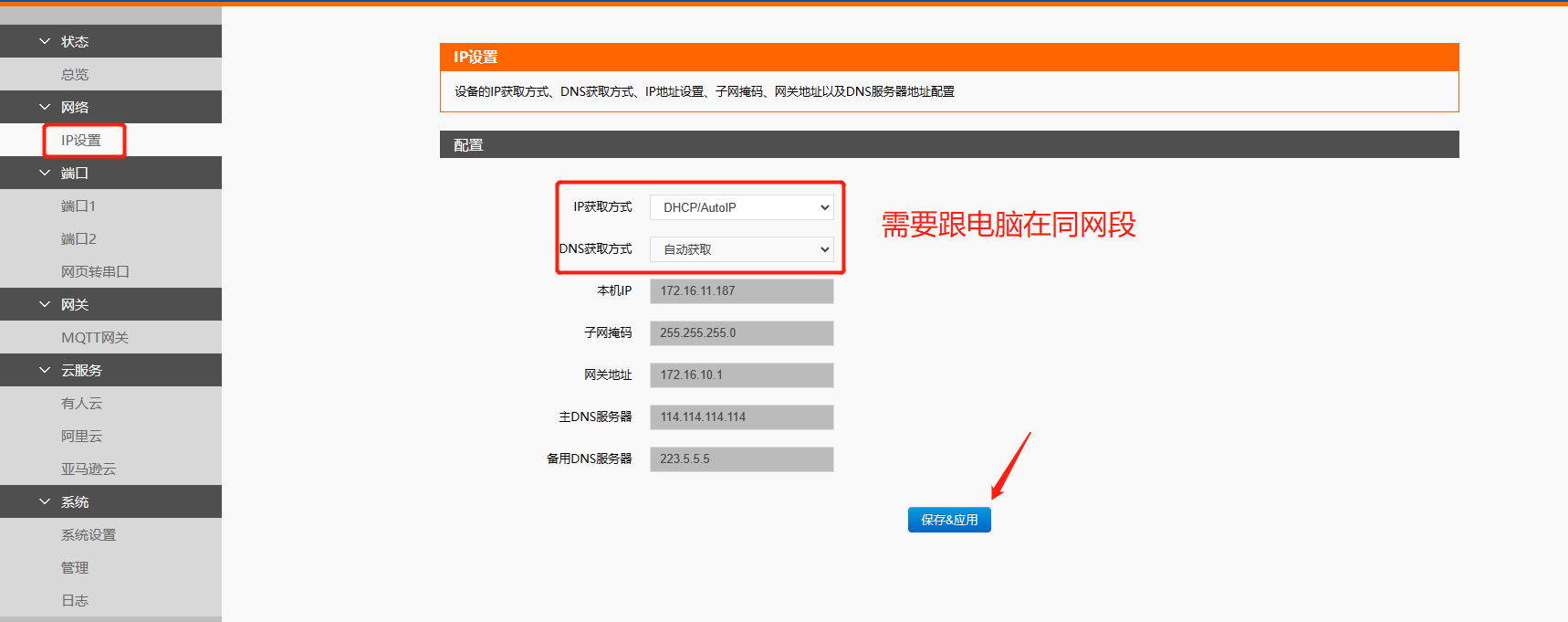 點擊“搜索設備”當搜索列表中出現E2的設備后,單擊搜索到的設備,查看其配置信息,設置模塊的ip需要跟電腦在同網段。(這邊是電腦跟E2模塊接了同一個路由器,所以選擇E2模塊DHCP動態獲取ip)