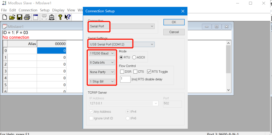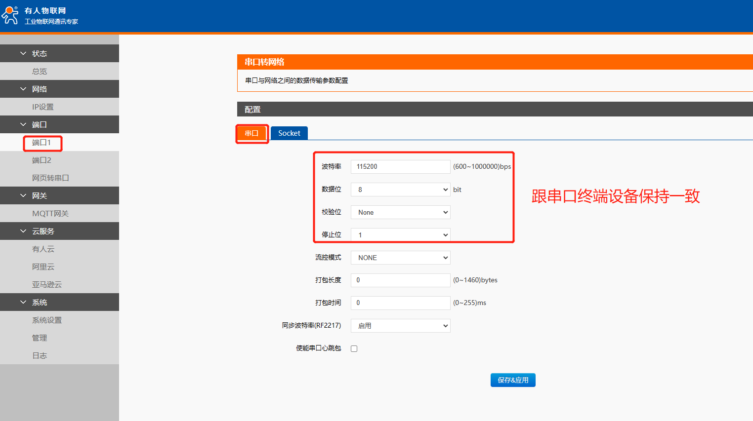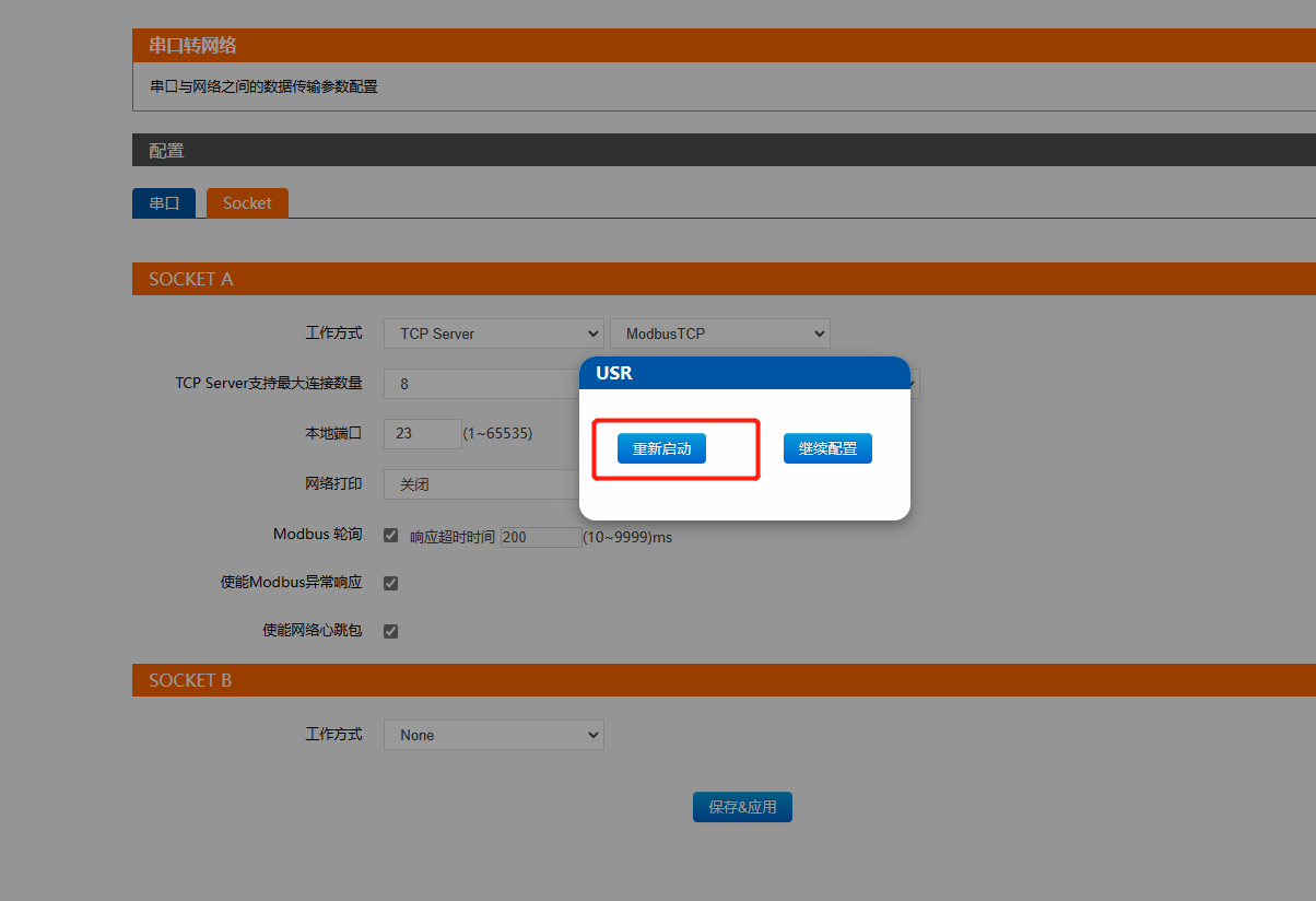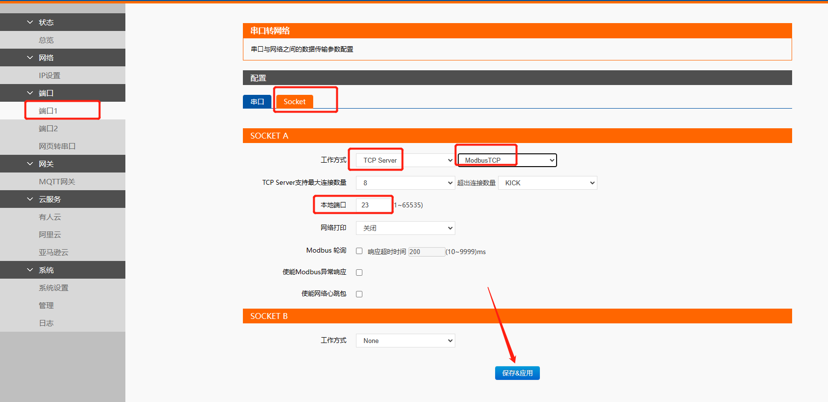 3、設置串口參數跟終端設備保持一致。Socket工作方式選擇Tcp server,本地端口23,并開啟modbus tcp使能,最后需要保存參數,重啟模塊。