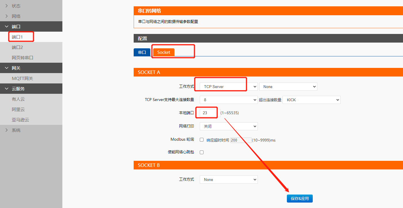 點擊“搜索設備”當搜索列表中出現(xiàn)E2的設備后,單擊搜索到的設備,查看其配置信息,設置模塊的ip,串口參數(shù)跟終端保持一致,Socket工作方式選擇Tcp server,本地端口23,點擊端口設置保存參數(shù)。