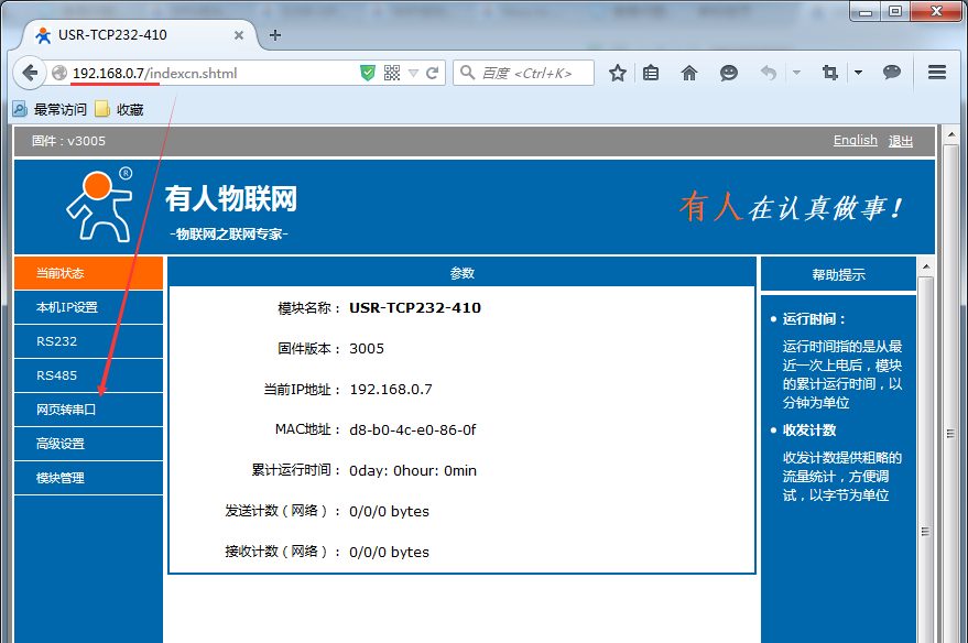 2:進入串口服務器的配置網頁:192.168.0.7.用戶名和密碼都是admin。找到網頁轉串口