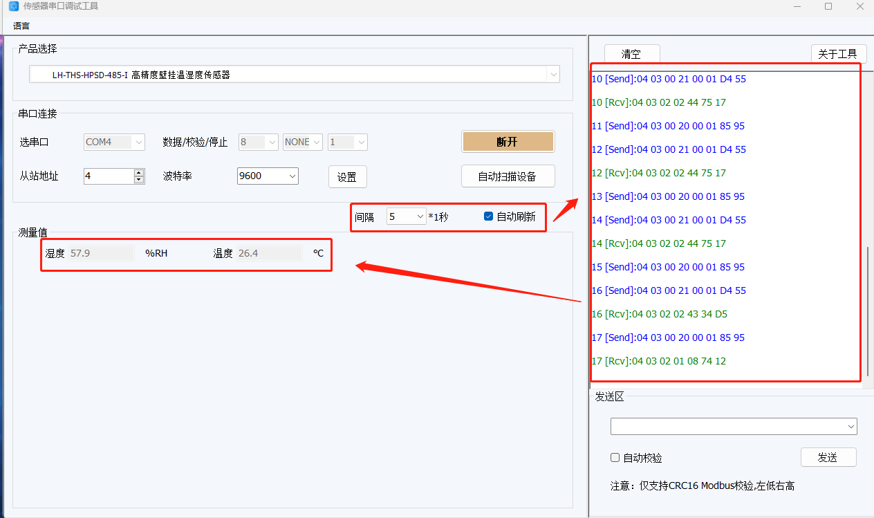 (4)點擊確定,選擇輪詢間隔,勾選自動刷新,軟件即會按照設(shè)定好的時間間隔去輪詢傳感器數(shù)據(jù)。傳感器獲取到溫濕度數(shù)據(jù),確認傳感器正常工作,接入到M100的485端口即可。