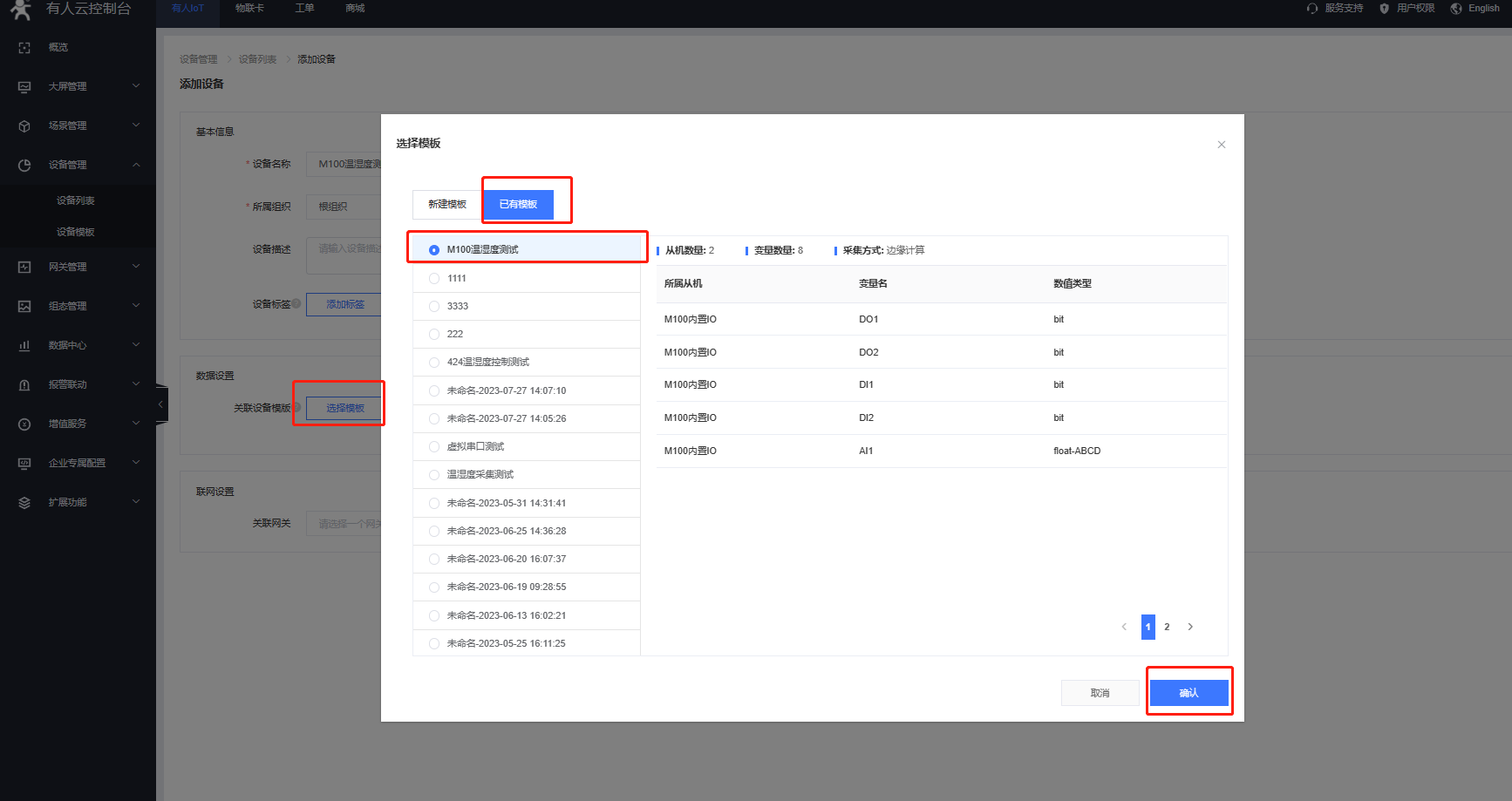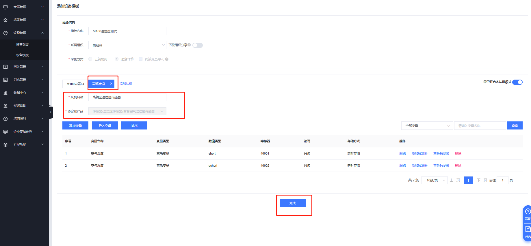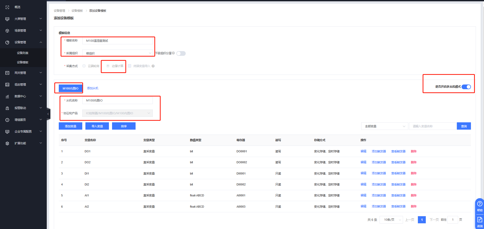 設(shè)備管理--設(shè)備模板---添加---模板名稱為:M100溫濕度測試--根組織---邊緣計算--開啟多從機模式,先添加M100的內(nèi)置IO