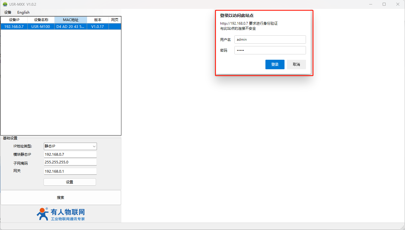 (5)登錄:輸入用戶名admin和密碼admin,點擊確定,右側(cè)顯示M100參數(shù)設(shè)置頁面。