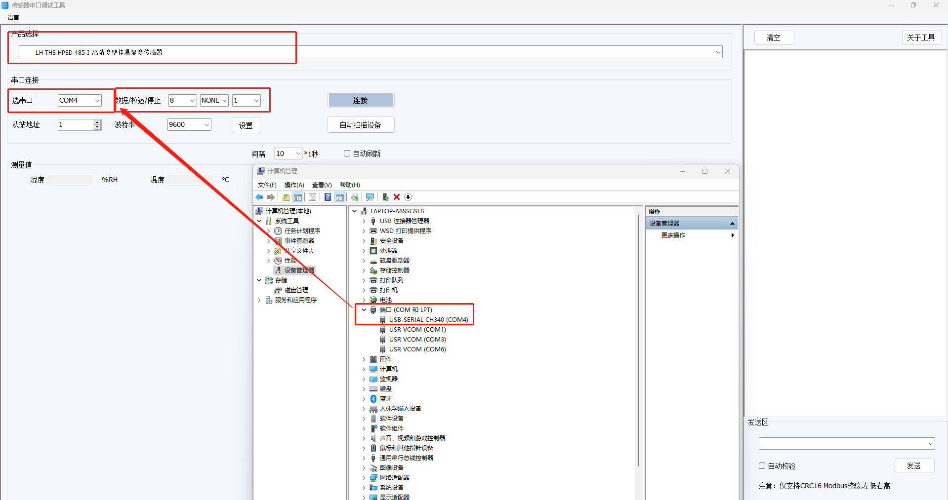 (1)使用USB轉(zhuǎn)485轉(zhuǎn)換器將LH-THSD-485-I接到電腦上,注意線序顏色不要接反,電腦打開控制面板--設(shè)備管理器--COM和LPT,確認轉(zhuǎn)換器驅(qū)動是否正常以及轉(zhuǎn)換器的COM端口號。