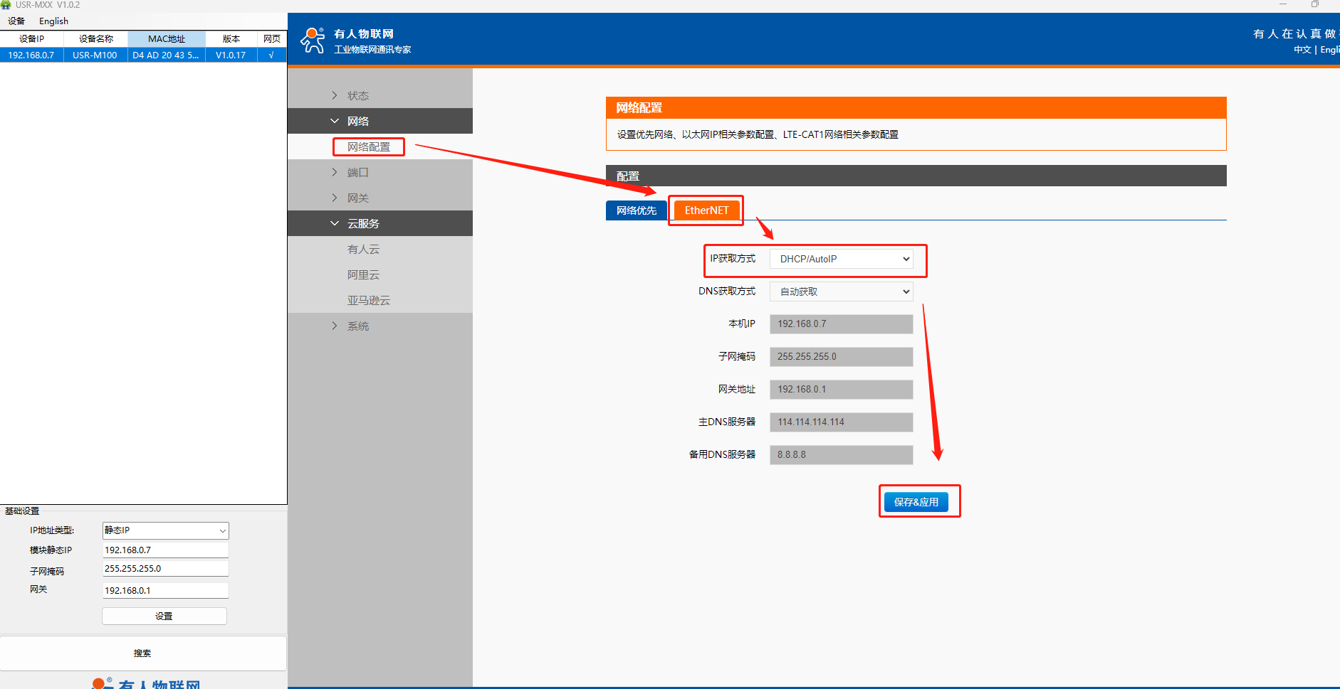 (8)在“網(wǎng)絡(luò)”>“網(wǎng)絡(luò)配置”>“EtherNET”界面中配置本機DHCP自動獲取IP或者設(shè)置靜態(tài)IP, 本案例配置為DHCP自動獲取IP,若需要配置M100靜態(tài)IP上網(wǎng)的話可以自行設(shè)置靜態(tài)ip(Static IP)。