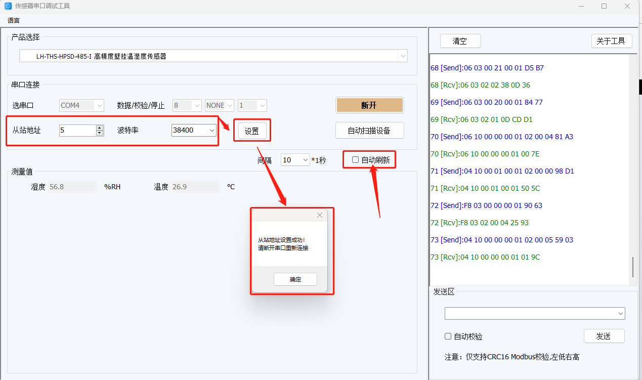 如需要修改傳感器參數(shù):先將自動刷新勾掉,填入目標從站地址和波特率,然后點擊設(shè)置,修改成功會彈出提示信息,修改后再將其接入到M100的串口上