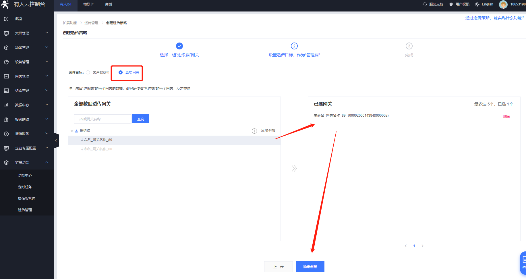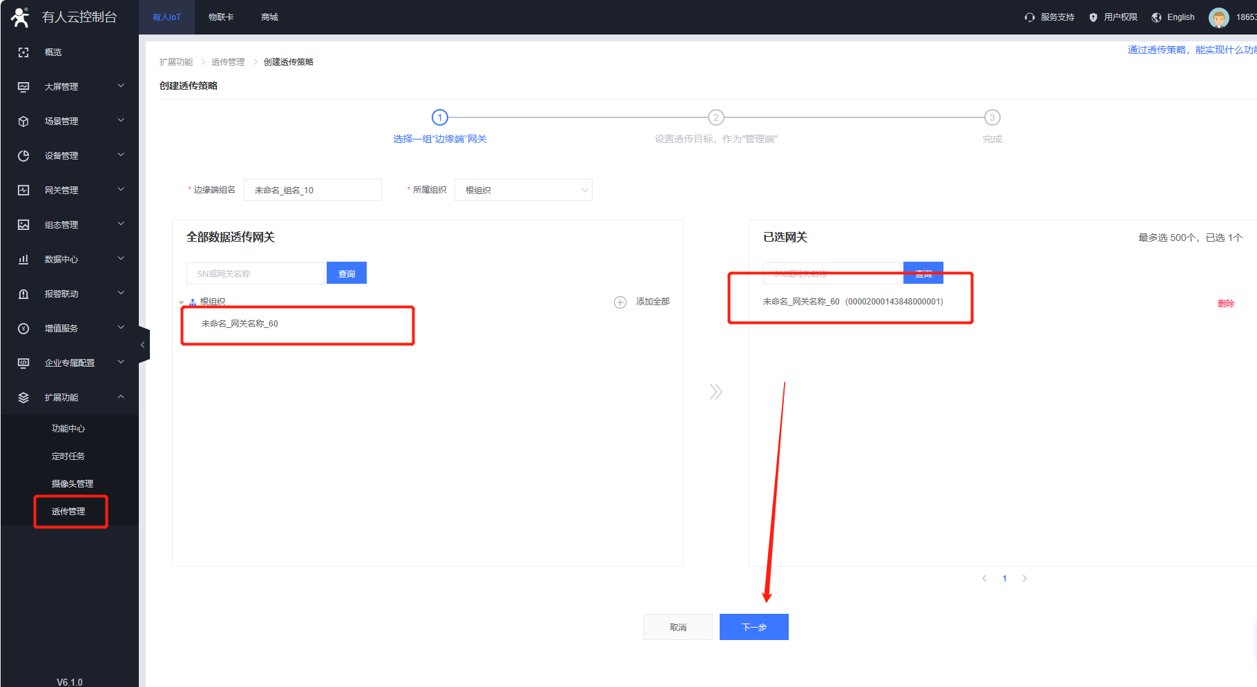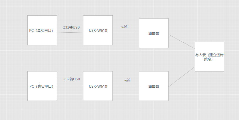 參考以上步驟用同樣的方式再添加另一個w610在有人云在線(同樣需要打開有人云透傳開關),并在云端建立透傳策略,如下:
