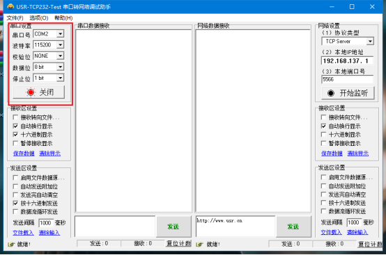 2、在串口調試助手打開虛擬串口創建的串口號;虛擬串口的波特率等參數是自適應的,這里可以不用設置