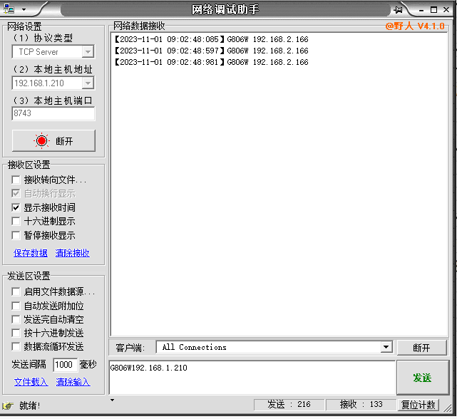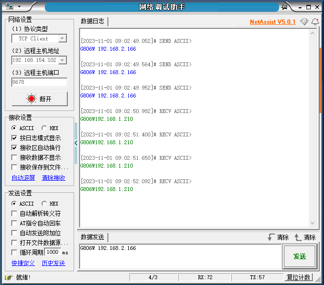 PC2即806w(B)的內網電腦,打開網絡調試助手,做tcp clinet端,IP設置806(A)獲取到的4G專網 IP,端口設置為端口轉發的外部端口。能夠連接到 4G 路由器下的 TCP Server 并進行通信。
