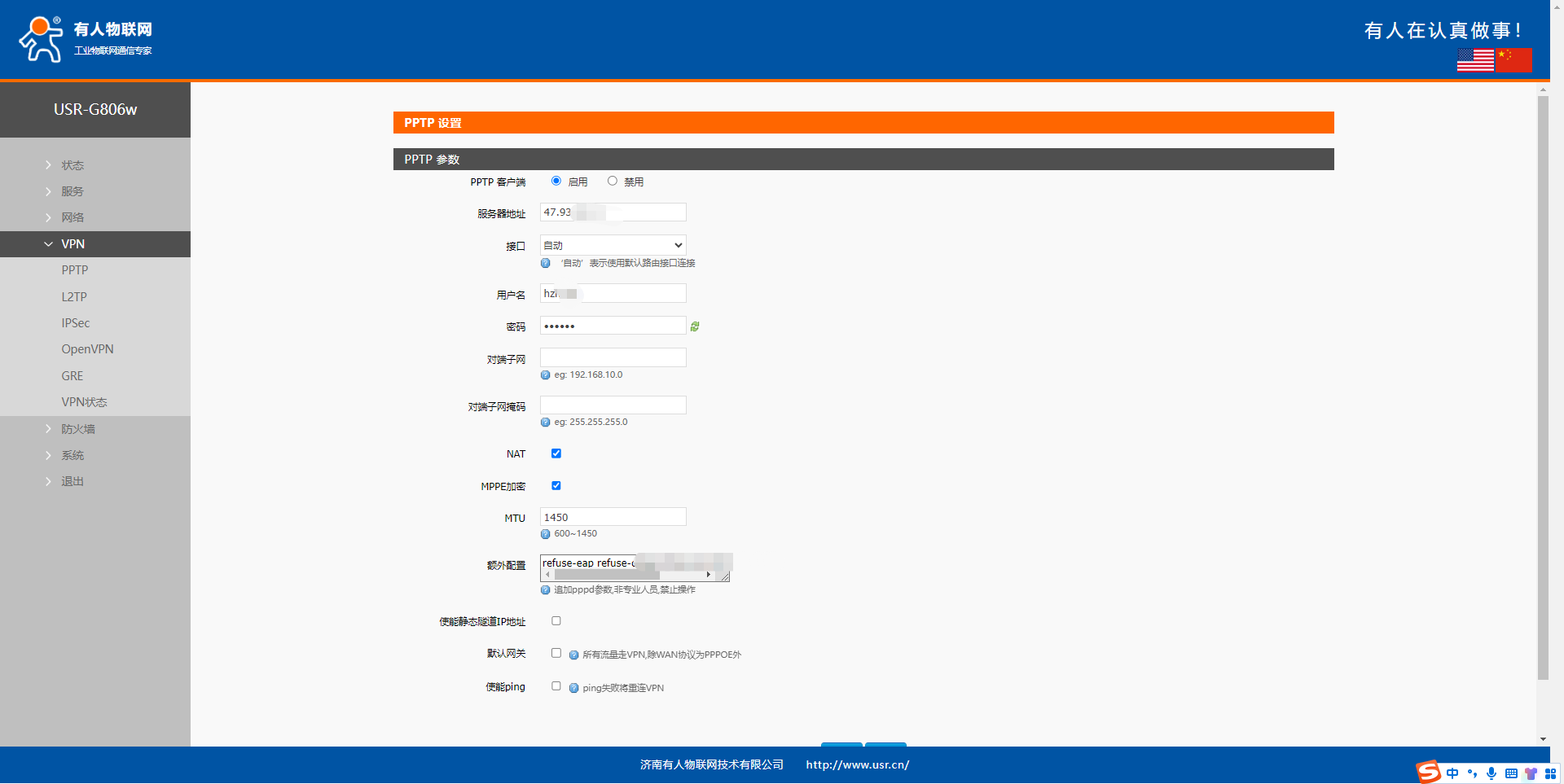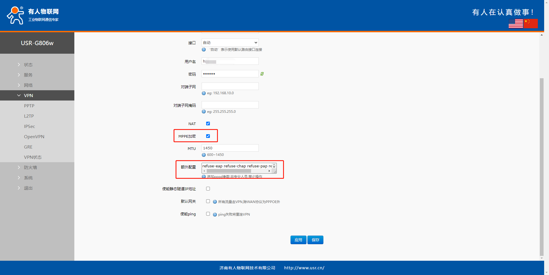 4>.加密方式與VPN服務器對應,其中加密方式可選:mppe stateful有狀態連接:會進行頻繁更換密鑰,且在更換密鑰時會出現嚴重丟包;mppe stateless無狀態連接:只有在丟包的時候會進行密鑰更改;no mppe服務端無 MPPE 加密方式時選擇此模式。額外配置:當以上配置不滿足配置文件和服務端向匹配時在此添加附加配置。例如服務端 MPPE 認證方式 為 only mschapV2,G806W 可在額外配置內添加 refuse-eap refuse-chap refuse-pap refuse-mschap 配置