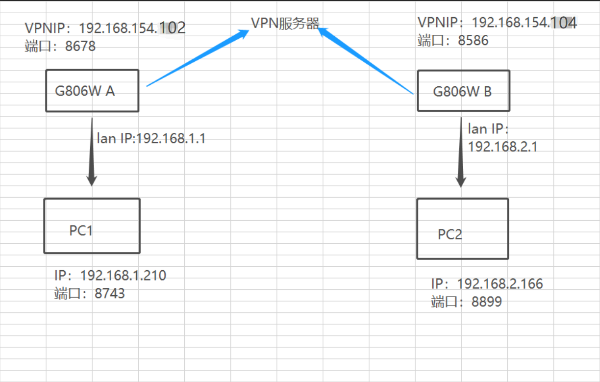 7>.到現在為止,兩臺G806W已經連接上VPN了,連上同一個VPN服務器的客戶端之前可以相互訪問,所以現在VPN其他客戶端訪問G806W獲取到的VPN IP是通的,但是訪問不到G806W下的終端設備。所以就需要設置端口轉發或靜態路由,本案例設置的是端口轉發。需要G806W下的終端設置設備網關和DNS。