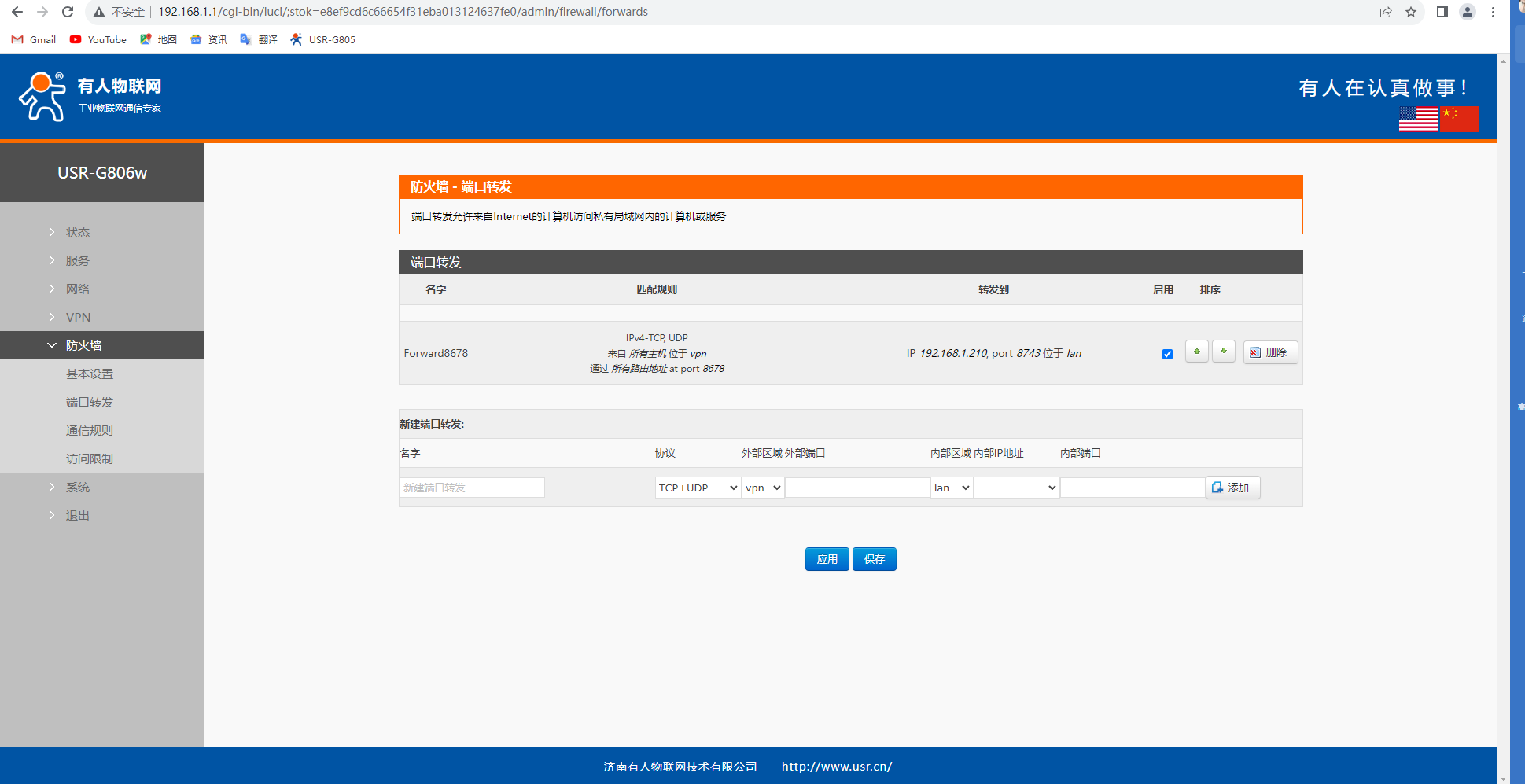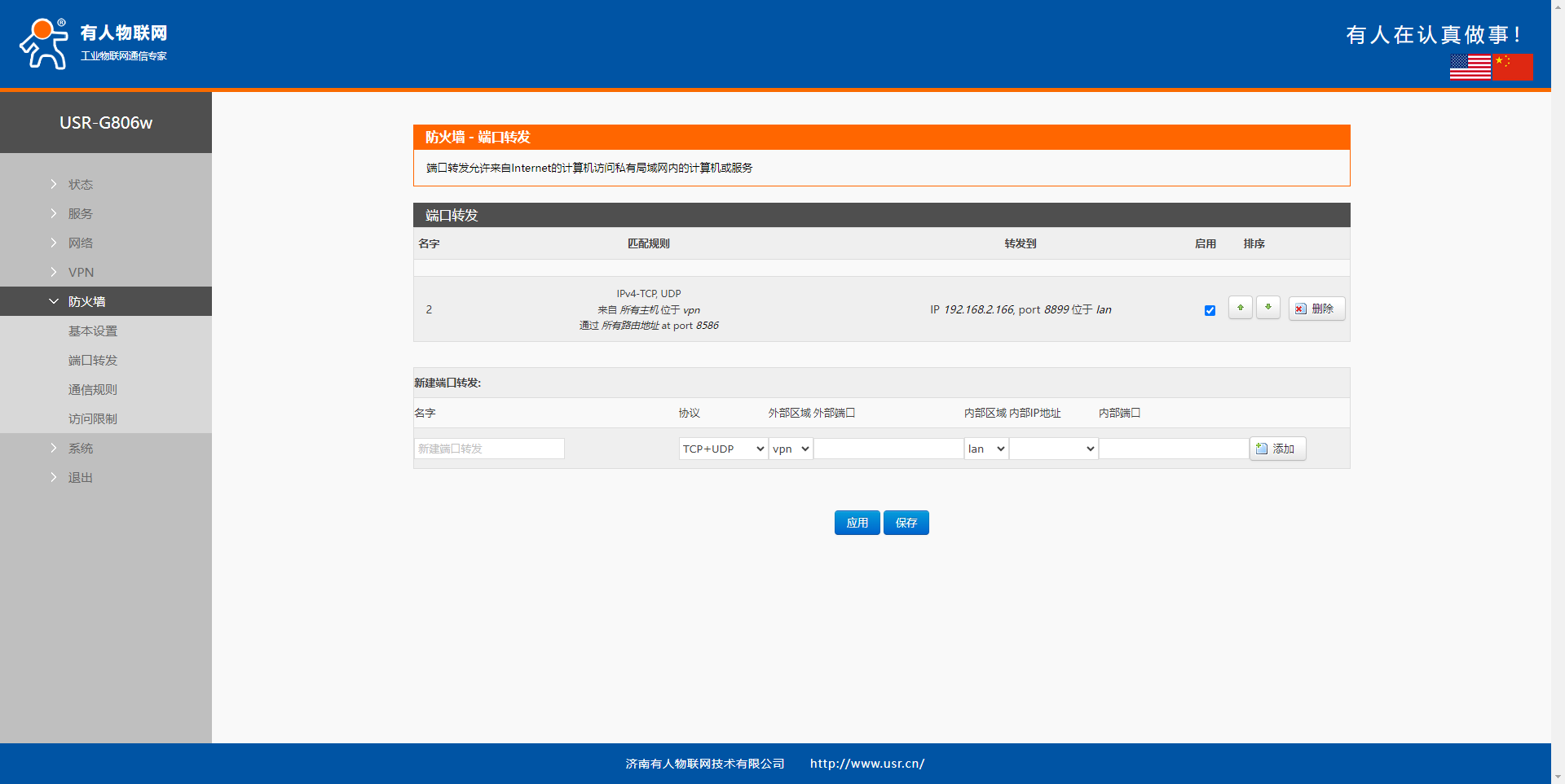 接下來設置端口轉發。在防火墻--端口轉發--新建端口轉發設置。名字自定義,選擇需要的協議和端口號,內部IP地址為本端的子網地址,也就是要把wan口數據轉發到的lan口地址。設置完成后點擊“添加”。
