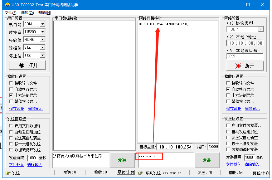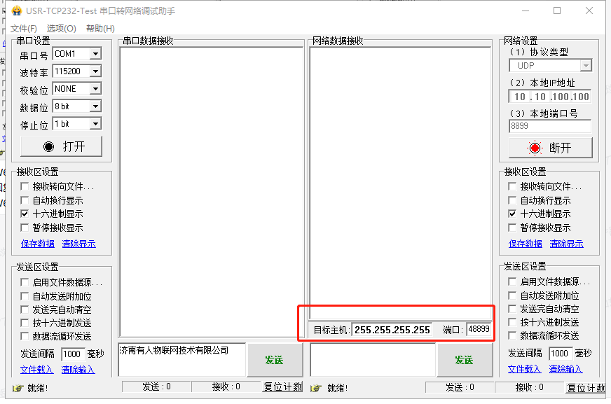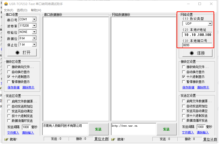1.安裝并打開USR-TCP232-TEST測試工具,設置右側網絡端協議為UDP,本機IP設置為電腦鏈接W610wifi獲取的IP地址
