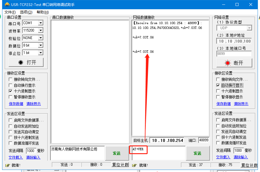 4. 在收到 ip,mac后,單播回復一個+ok 后可以使用, 查詢的AT指令必須是大寫加回車換行發送