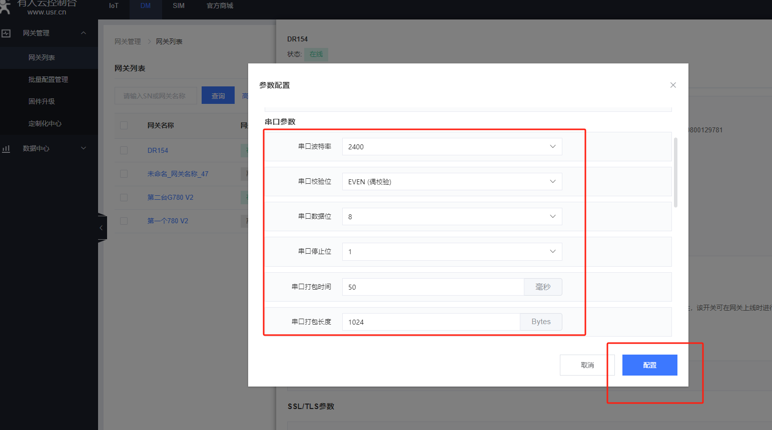 8.跳轉(zhuǎn)到DM平臺,配置DR154的串口參數(shù)改成和要接的電表一致,電表串口波特率、校驗、數(shù)據(jù)位、停止位是:2400,even,8,1,設(shè)置完點配置。