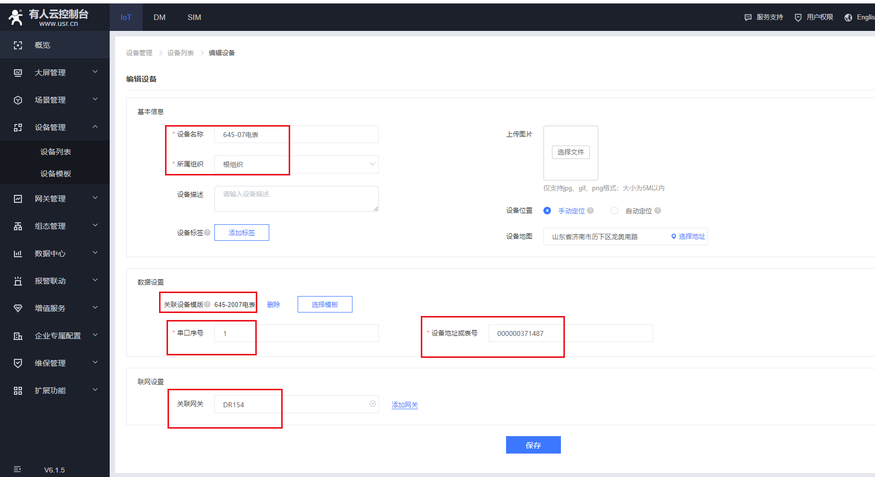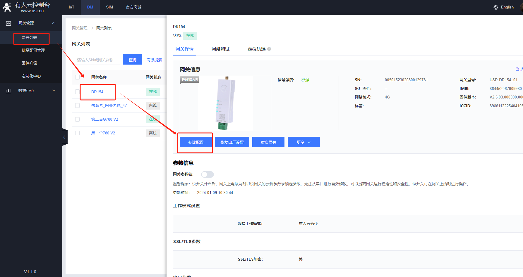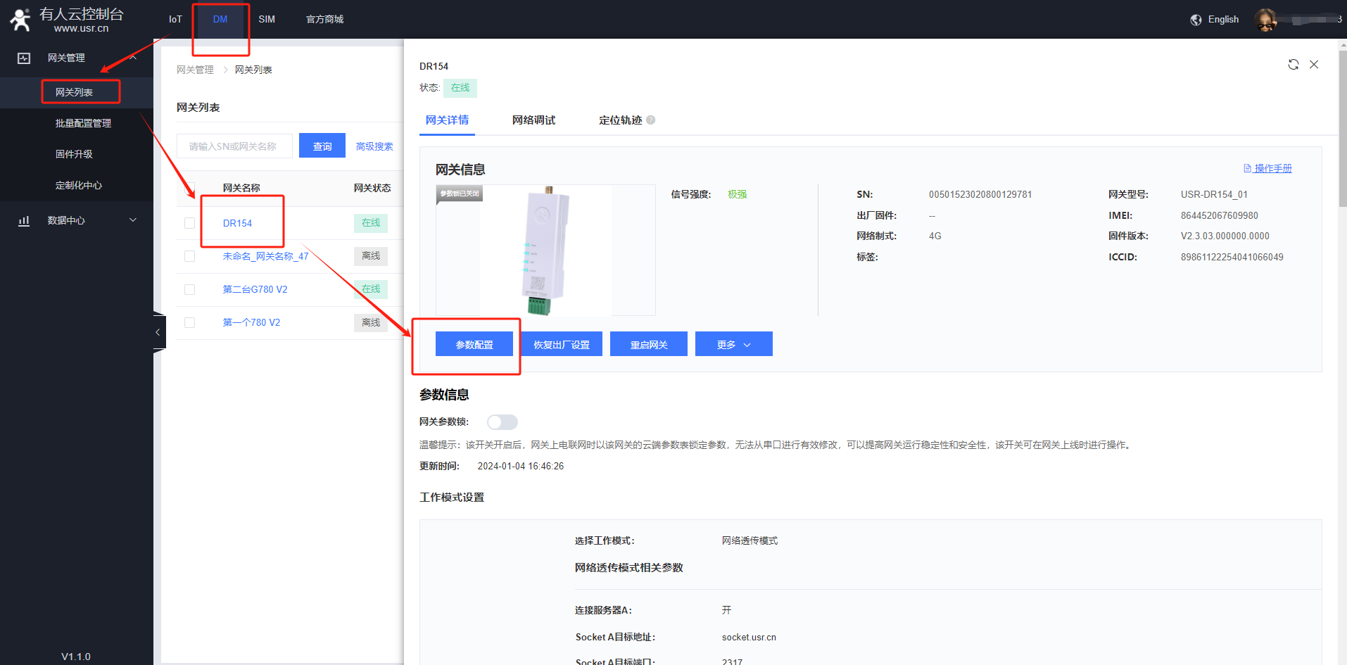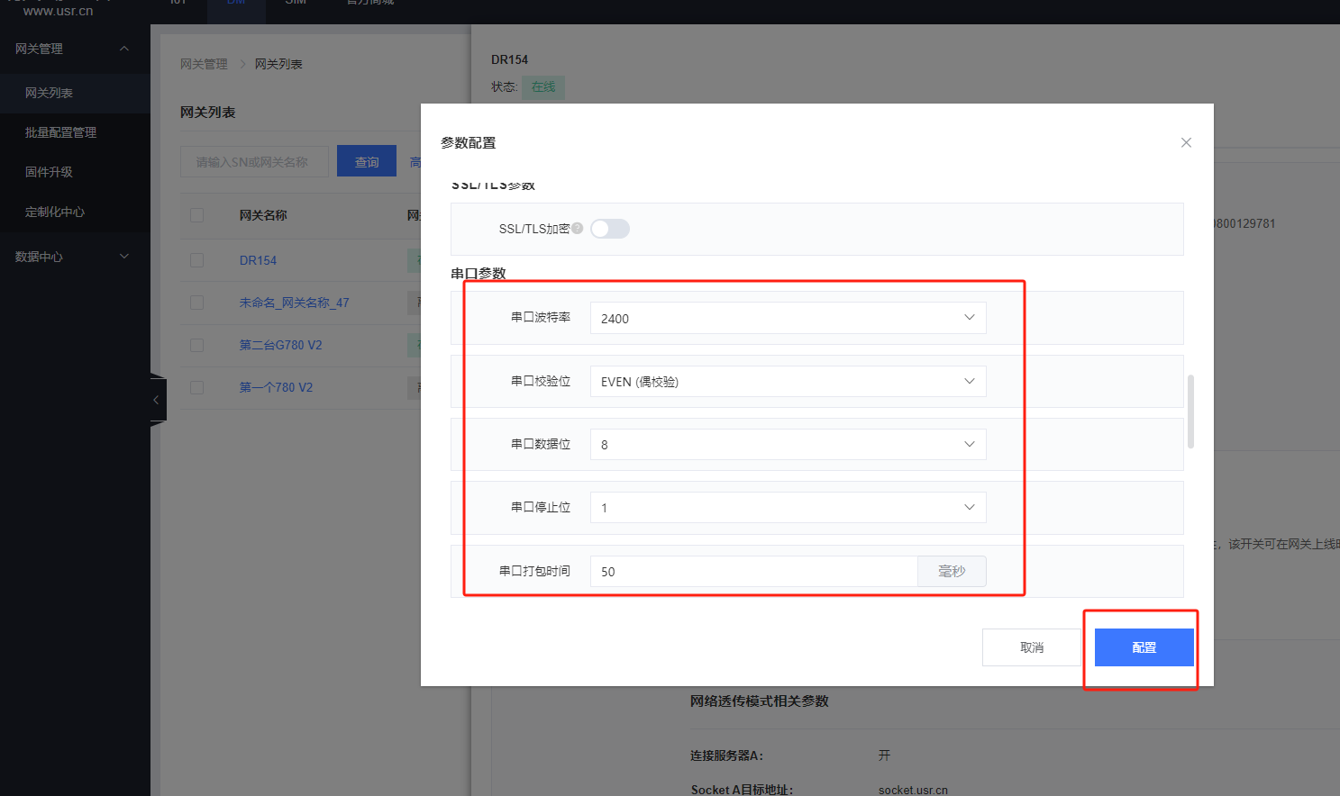 3.在DM平臺——網(wǎng)關(guān)列表——找到添加的154——參數(shù)配置,修改串口參數(shù)和要接的電表一致。