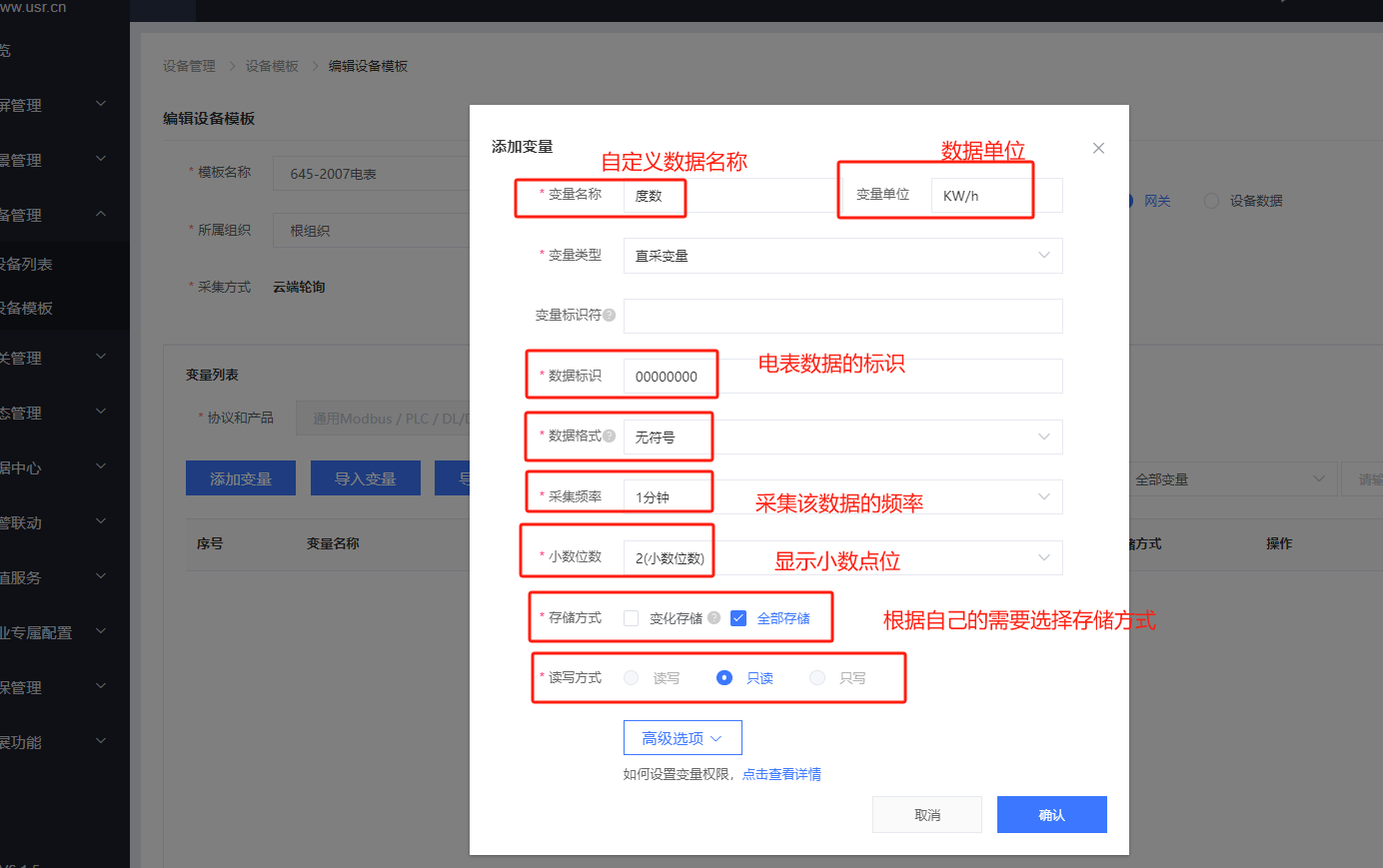 5.點擊添加變量——本次案例展示讀取電表度數(shù)的變量配置:
