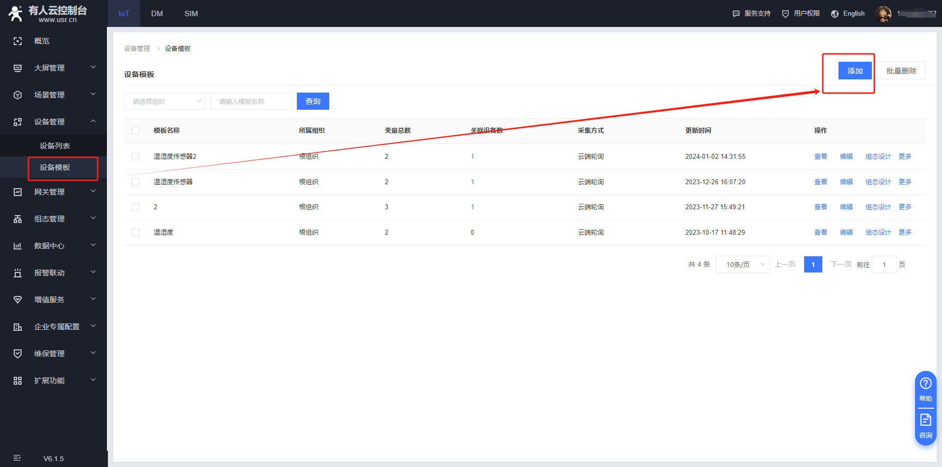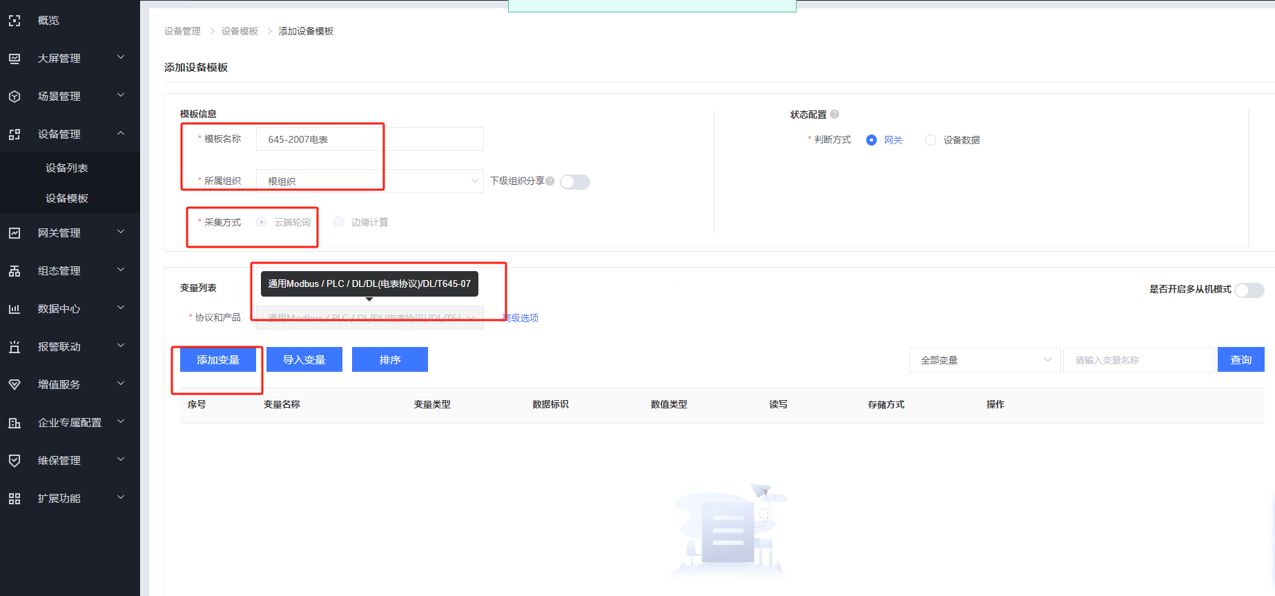 4.設(shè)備管理——設(shè)備模板,添加采集的電表模板,協(xié)議選擇645-07協(xié)議,采集方式選擇:云端輪詢 模板名稱和組織可以自定義
