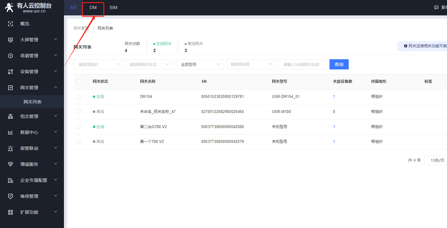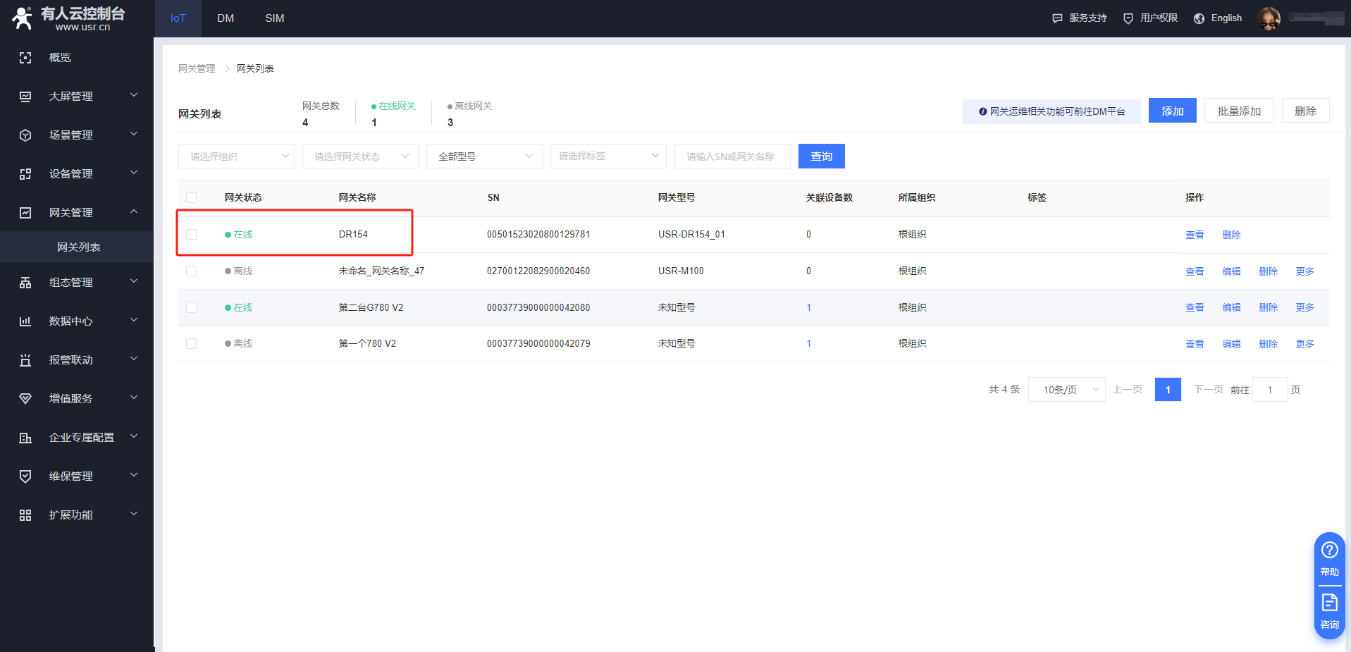 在網(wǎng)關(guān)管理---網(wǎng)關(guān)列表可以看到我們掃碼添加的154設(shè)備,如果設(shè)備目前處于離線狀態(tài),可以檢查一下設(shè)備自身是否可以正常聯(lián)網(wǎng)。在設(shè)備正常聯(lián)網(wǎng)狀態(tài)下可以重啟下設(shè)備,可以看到設(shè)備的在線信息。