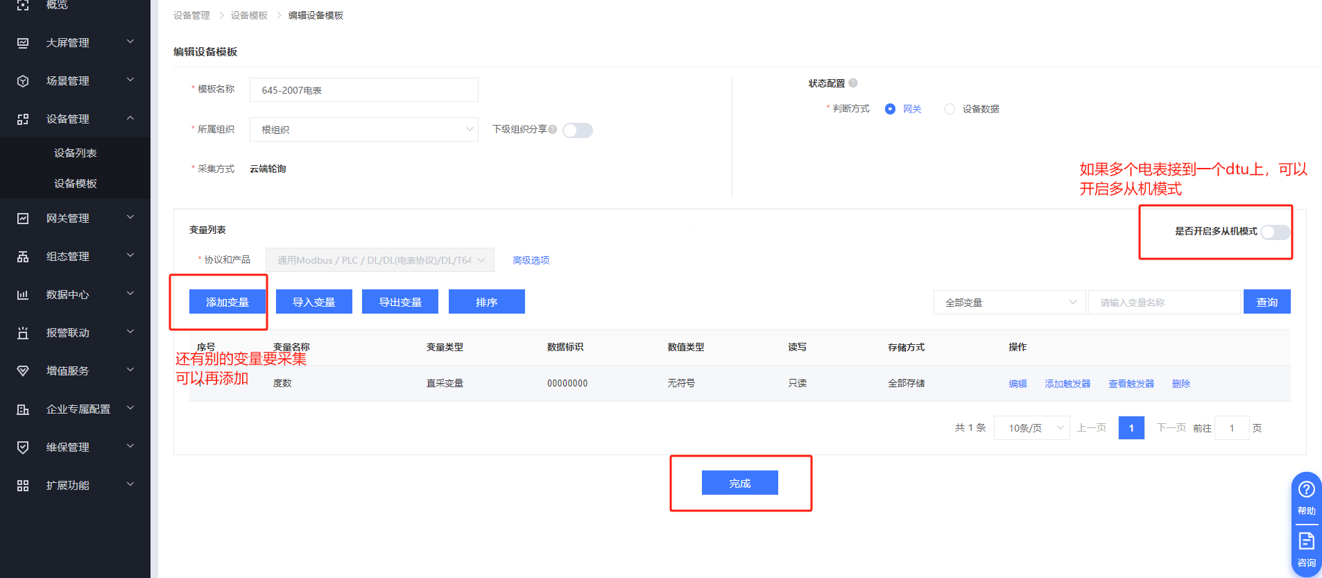 6.點擊確定生效(若還需采集該電表的其他數(shù)值,可繼續(xù)點擊添加變量。也可后期自行在瀏覽器左側(cè) 設(shè)備管理 - 變量模板 中選擇該模板進行編輯添加變量,如果多個電表接到同一個dtu上,也可以開啟多從機),云設(shè)備添加成功。