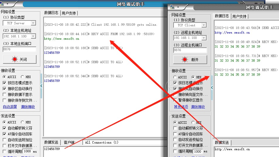 一臺電腦做tcp server,開啟監聽, 另一臺電腦做tcp client 進行連接,數據通信測試。