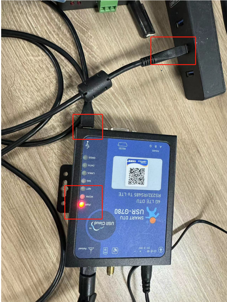 3.接著給780s斷電,確保所有指示燈都滅掉之后,按這reload按鍵給設備上電,上電之后松開reload按鍵,然后用數據線安卓口,接780s的升級口,另一端usb接電腦,如圖