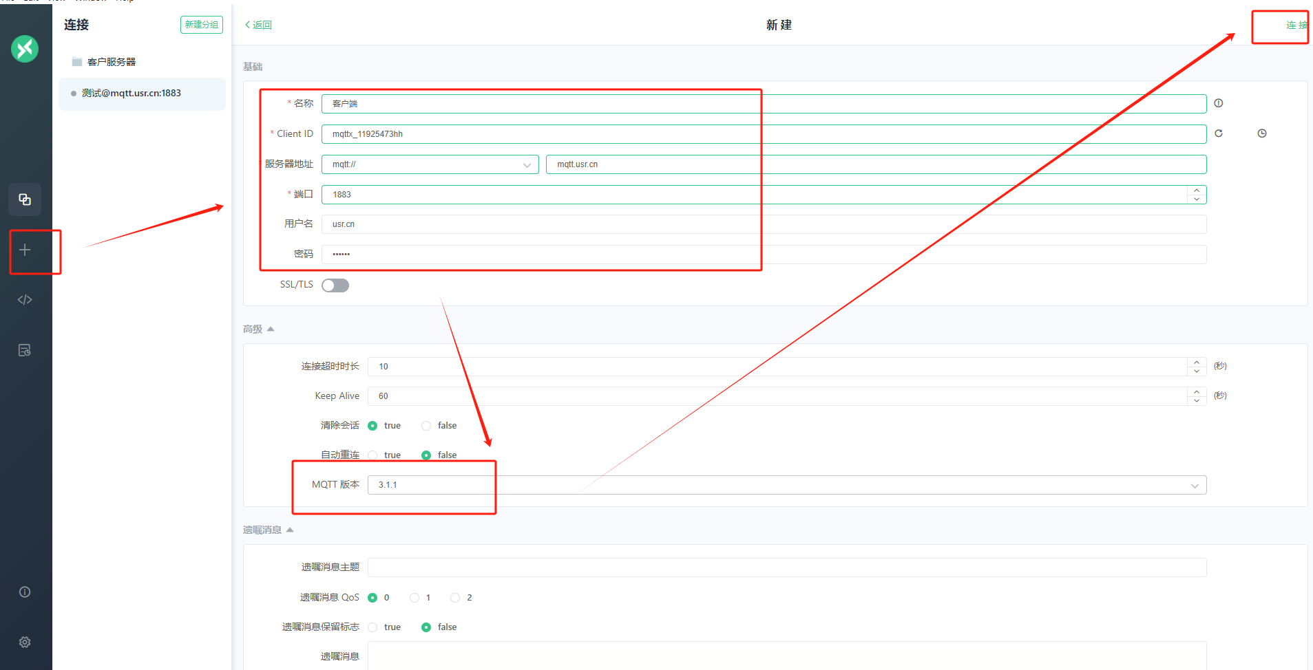配置連接mqtt服務器的參數,測試用的我司的mqtt測試服務器