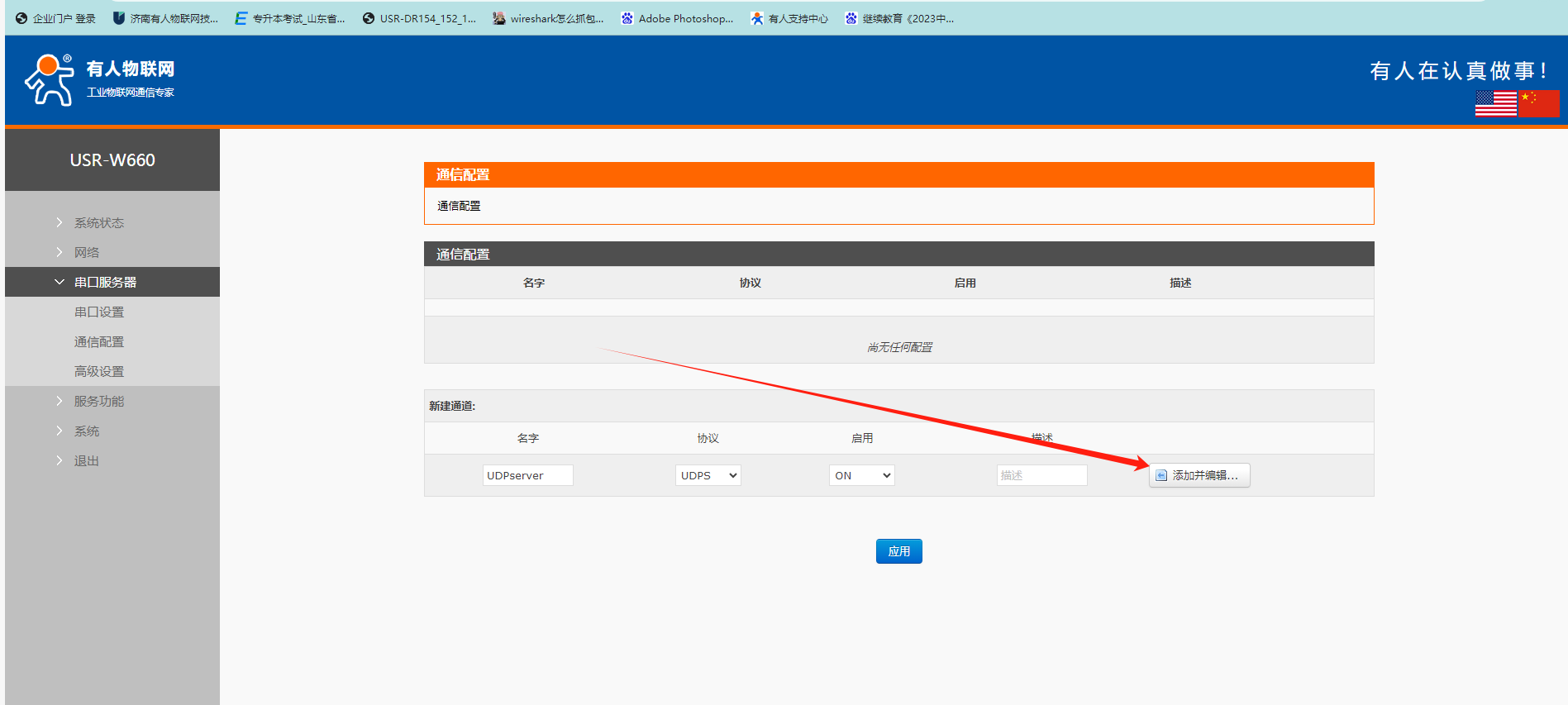4、W660設置為UDP SERVER.設置方法如下,點擊添加并編輯