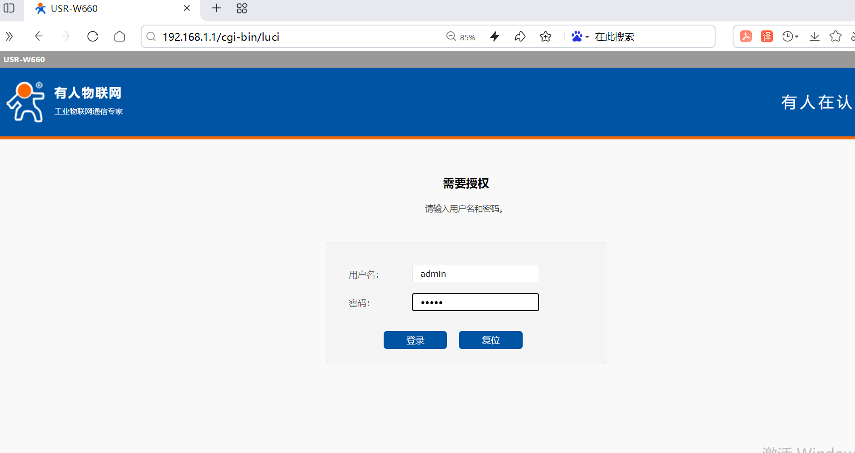 2、在瀏覽器輸入W660默認IP :192.168.1.1。用戶名密碼都為admin