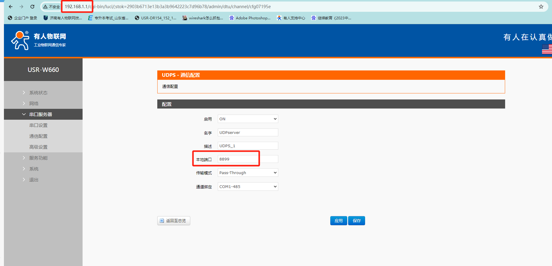 設置設備本地端口為8899 ,服務器的IP就是W660的本身的IP192.168.1.1不用設置。設置完參數保存重啟才會生效