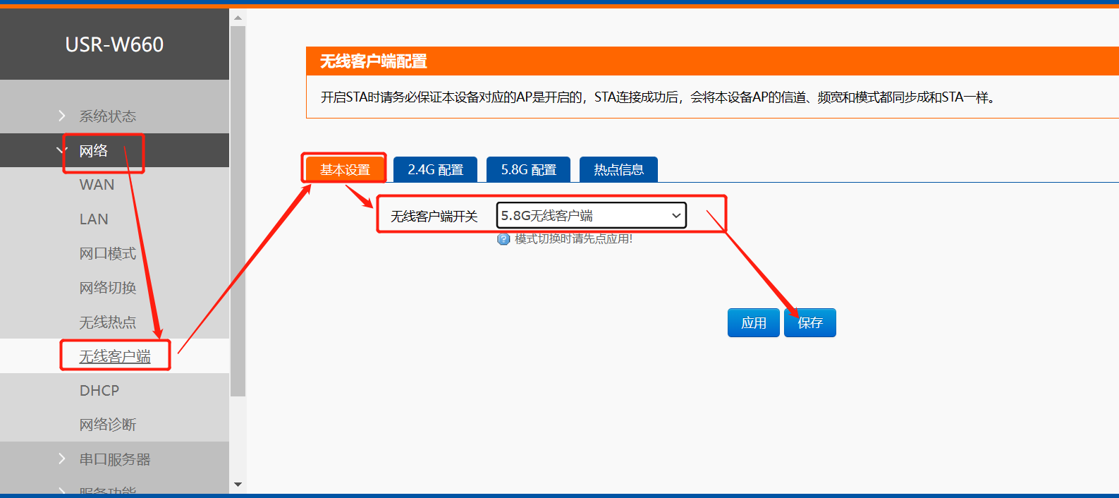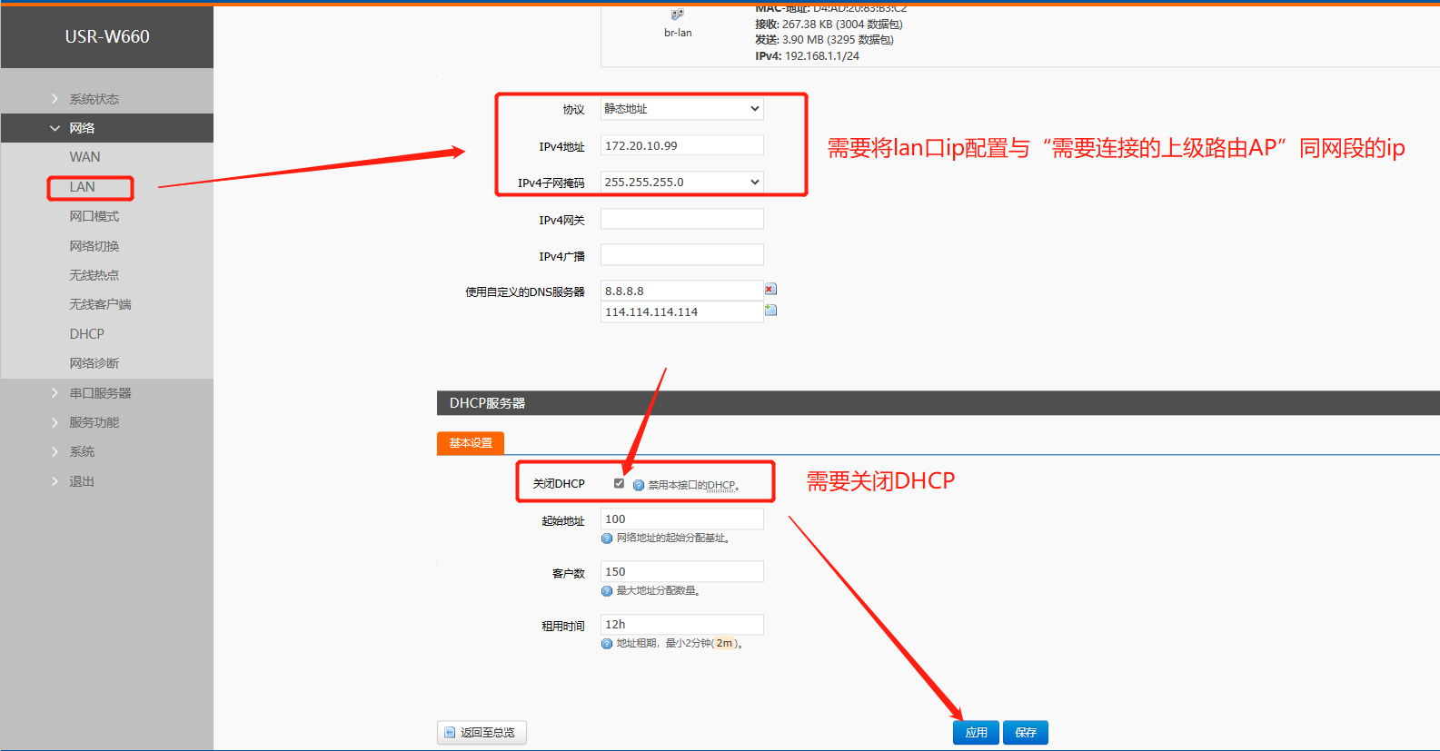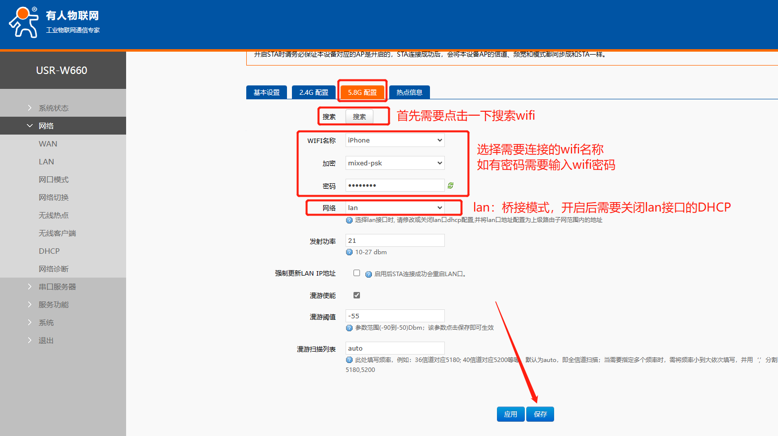 2、配置W660為STA模式(開啟無線客戶端),搜索需要連接的AP,輸入wifi名稱和密碼,開啟lan橋接模式,配置W660的lan ip跟上級AP要在同網段,并需要關閉lan接口下的DHCP功能,設置完所有參數后,需要點擊保存并應用