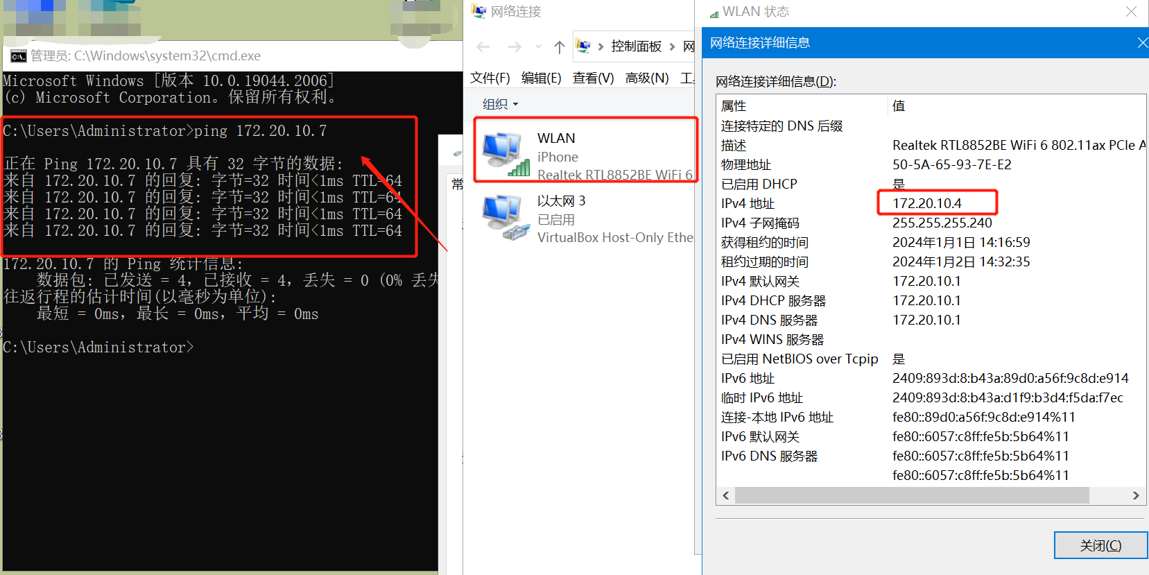 用另一臺PC2無線連接上級AP,可以看到PC2的獲取到了172.20.10.4,最終可以實現2臺電腦互相ping通
