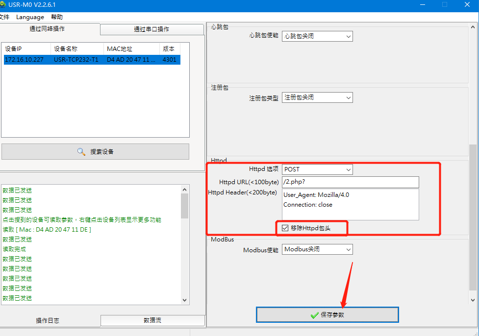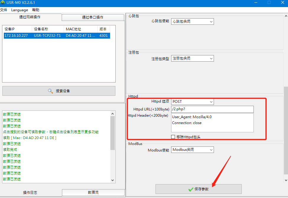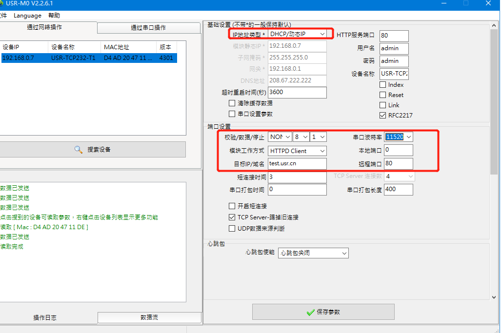 4.IP設置為DHCP,模塊設置為Httpd Client模式,請求方式POST,URL為/2.php?,設置服務器地址test.usr.cn,端口80,設置并保存所有參數,重啟模塊。(本說明文檔使用為有人測試服務器)
