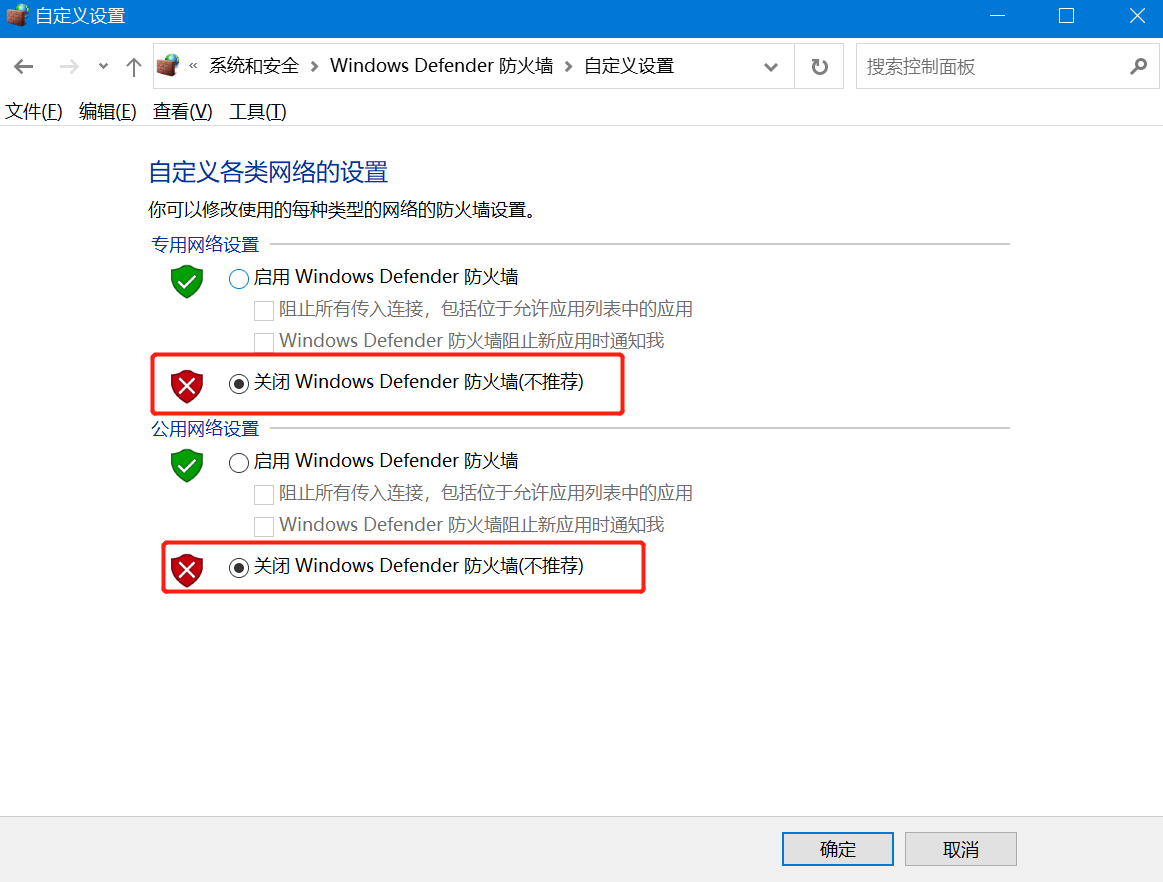 從控制面板---系統與安全---Windows防火墻,關閉防火墻并禁用與本次測試無關的網卡。并關閉電腦殺毒軟件。