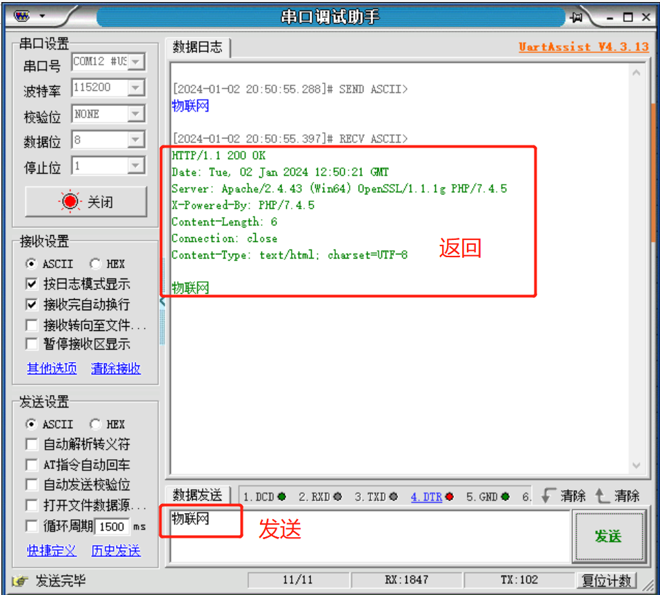 5.如果不勾選“移除httpd包頭”,從串口發送物聯網,會看到服務器返回的包頭和數據
