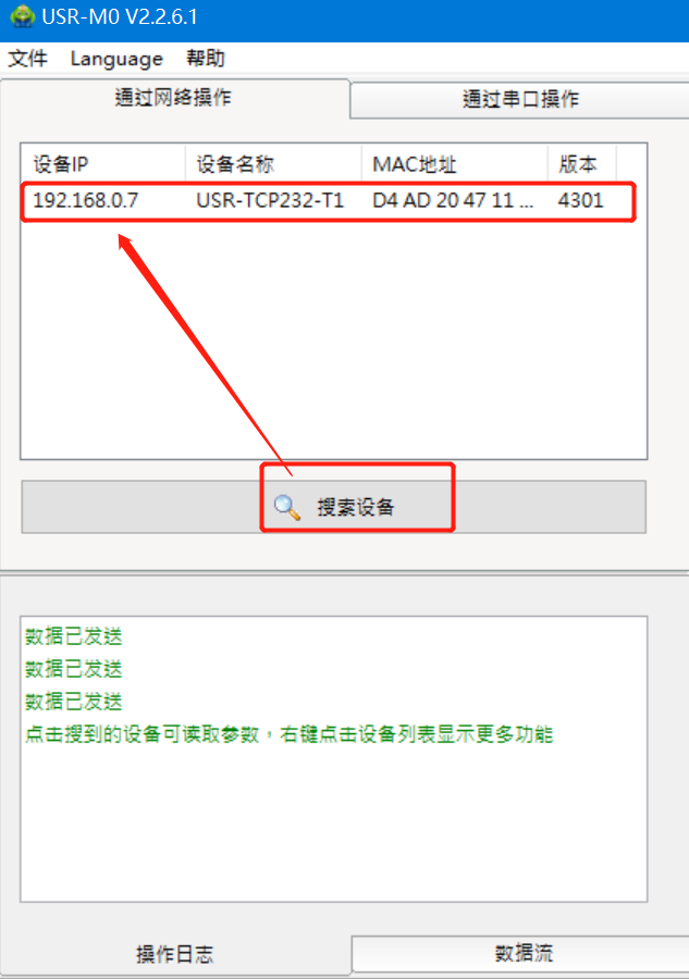 3.點擊“搜索設備”當搜索列表中出現T1的設備后,單擊搜索到的設備,配置其參數