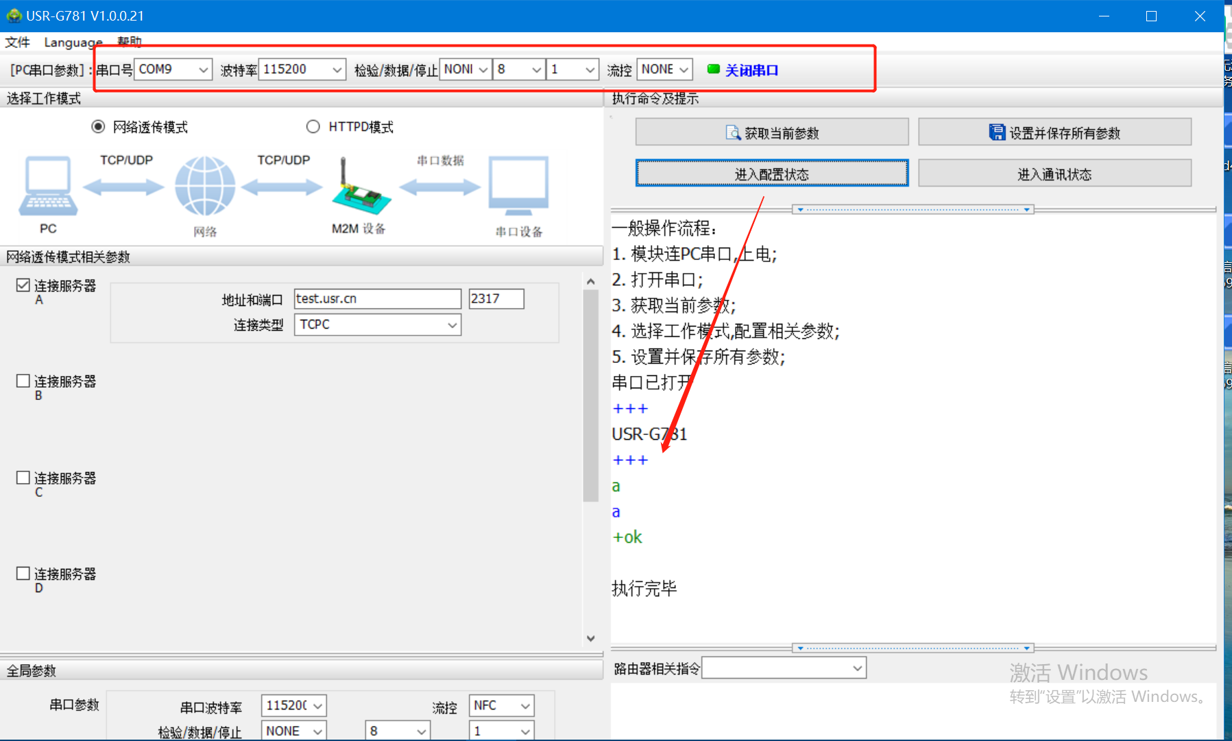 2、設(shè)備出廠默認(rèn)波特率115200 NONE 8 1 打開(kāi)串口,進(jìn)入配置,設(shè)備回復(fù)OK