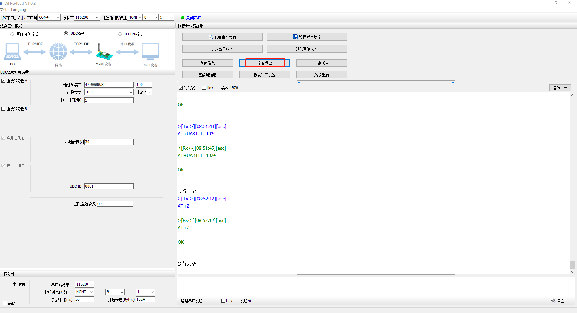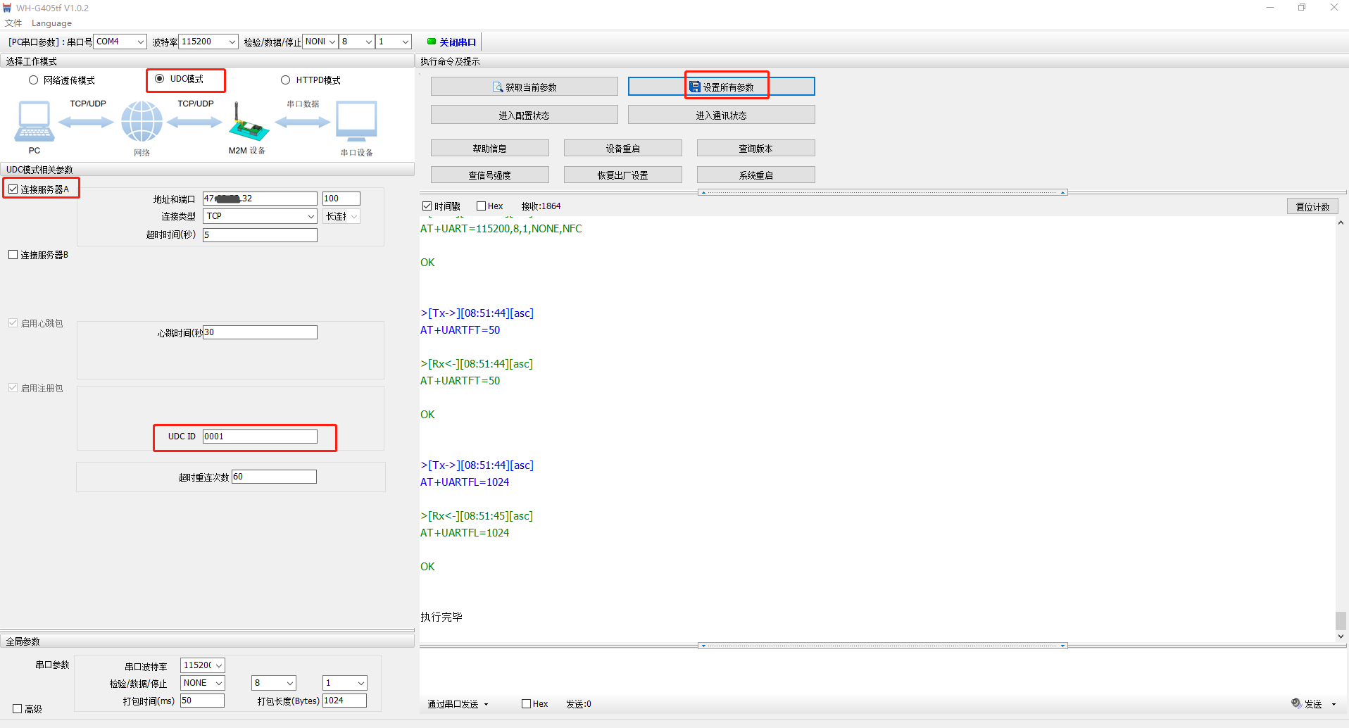 4、選擇UDC模式,勾選連接服務器A,地址設置要連接的遠程服務器地址,端口100,連接類型TCP,長連接。UDC ID用0001。設置完參數,點擊設置所有參數,點擊設備重啟。