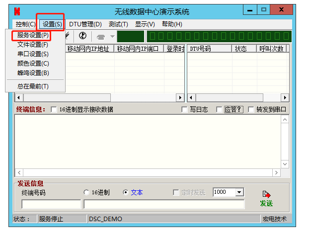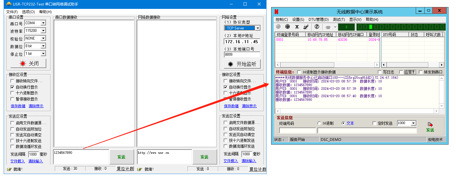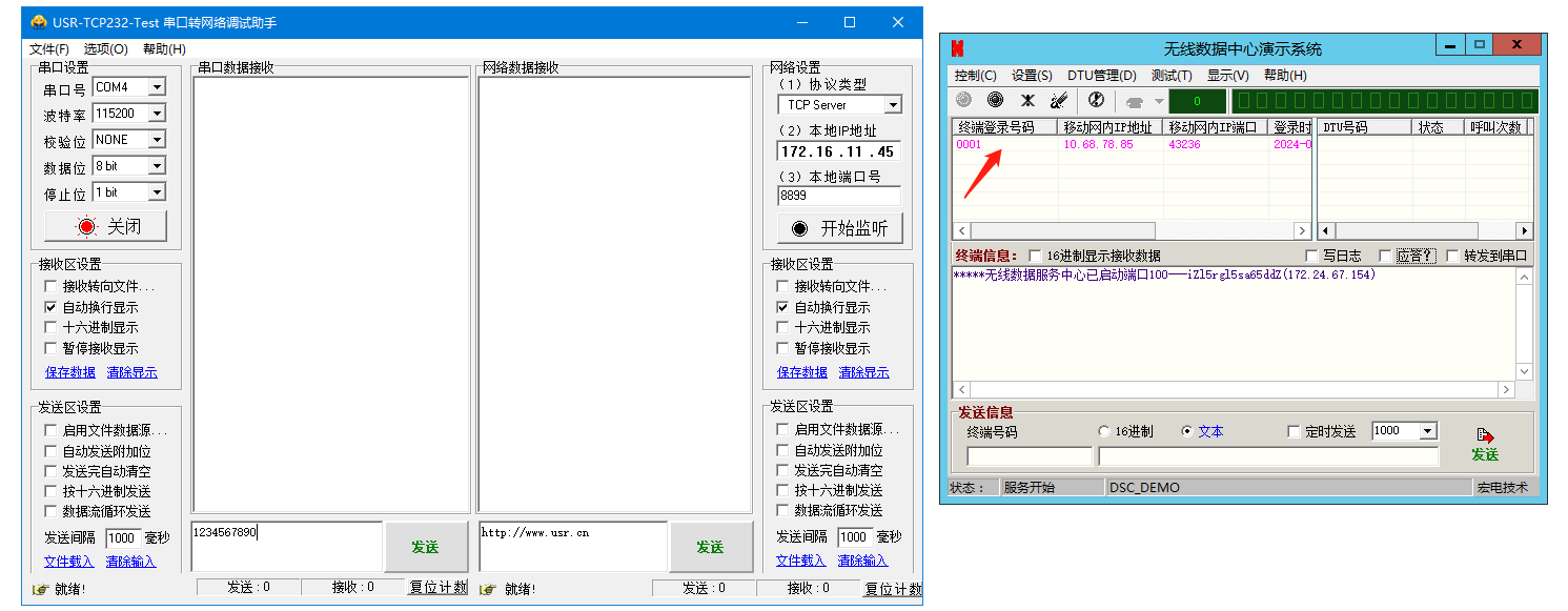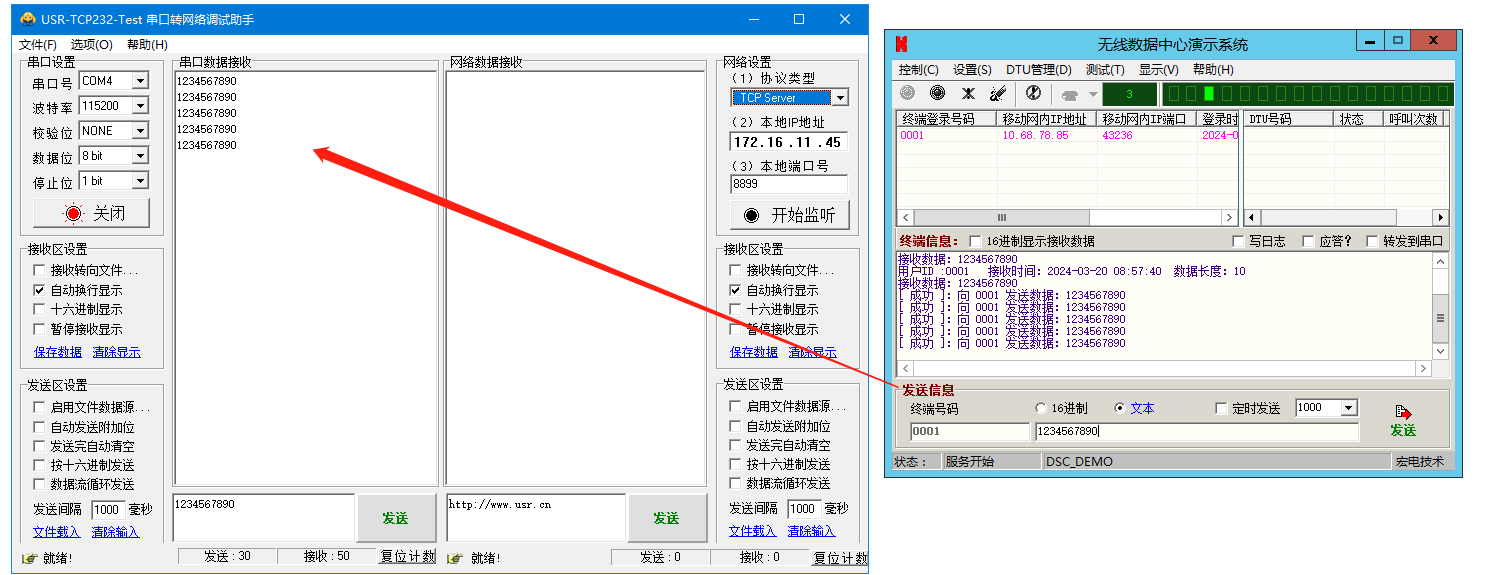 6、無線數據中心演示系統發送信息區,對終端號碼0001,發送1234567890,WH-LTE-7S4 V2連接的串口助手,接收到數據1234567890。