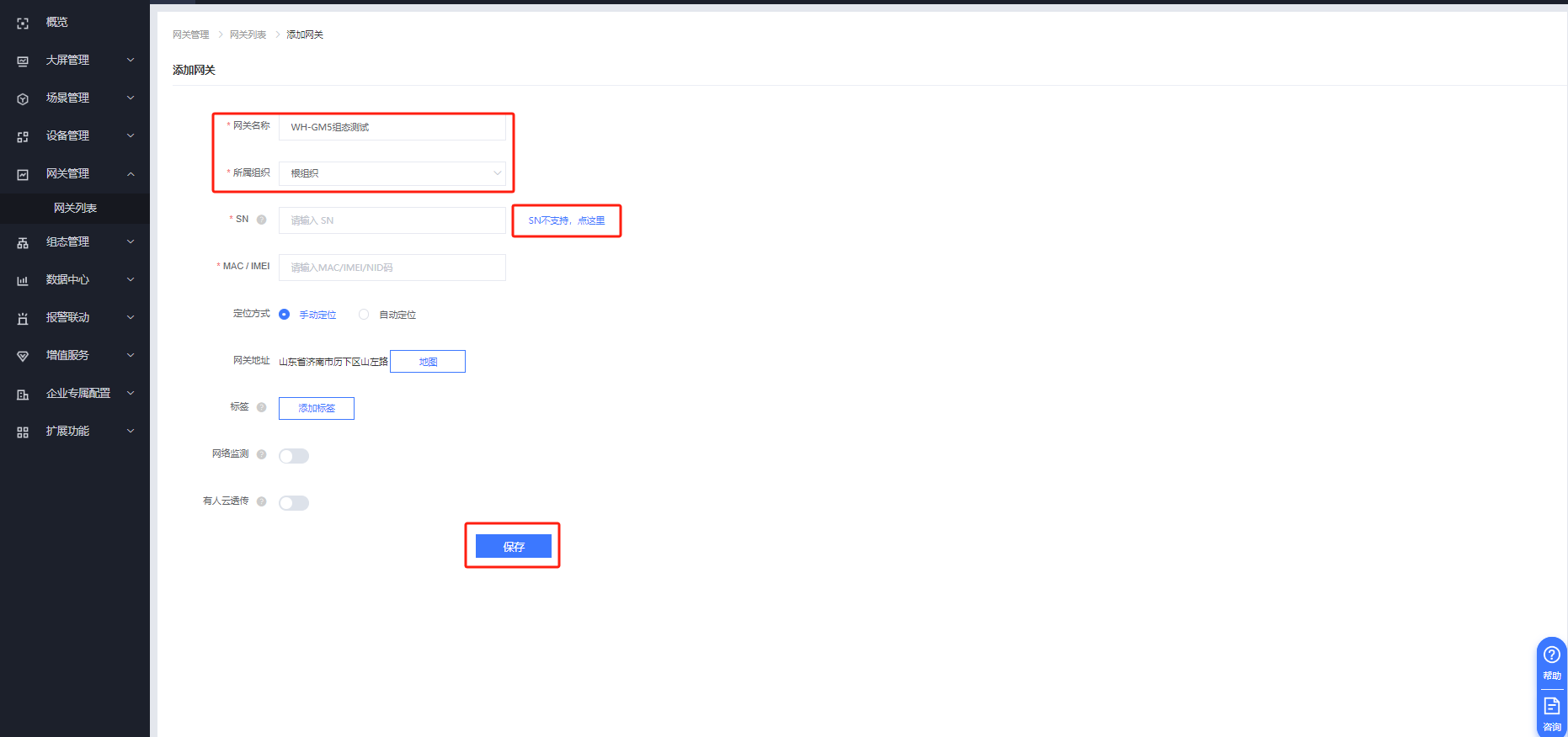 填入網關名稱,選擇組織,注意選擇“SN不支持,點這里”點擊保存即可