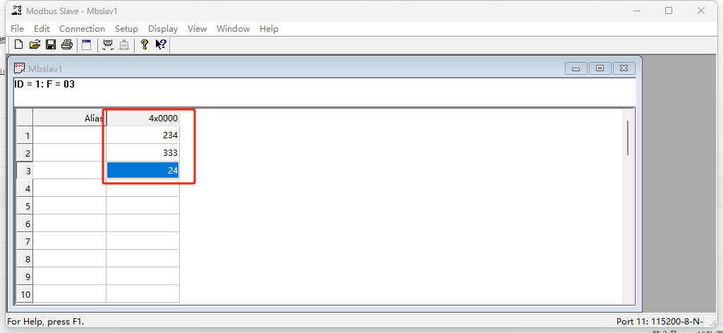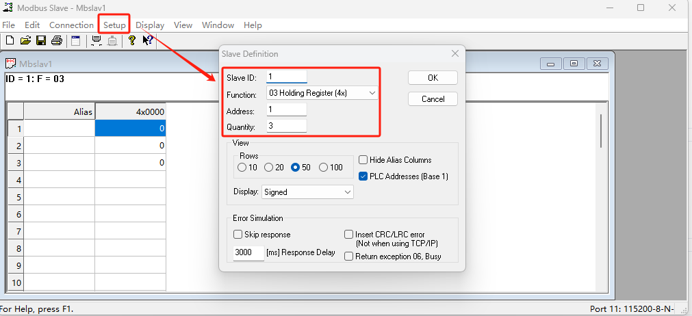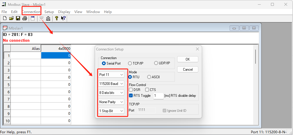 使用modbus slave軟件模擬從機,調用COM11,串口參數選擇115200 N 8 1(和WH-GM5TF-CT-4-N40保持一致)