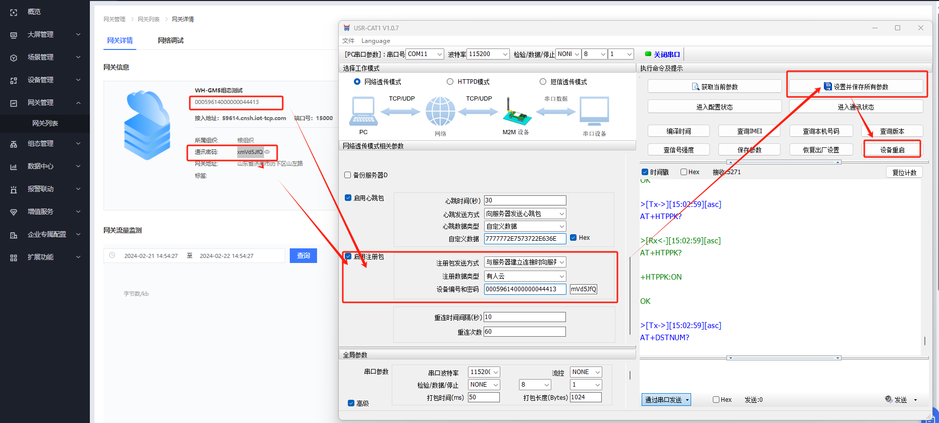 點擊獲取當前參數,然后將有人云給GM5分配的接入地址和ID 密碼填入到GM5中,設置并保存所有參數,然后重啟設備