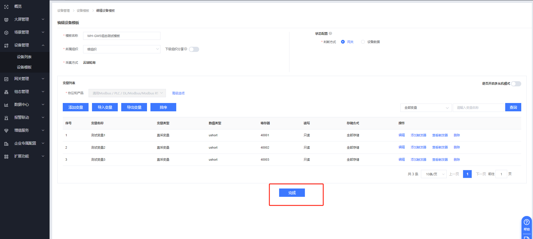 同樣方式添加測試變量2、測試變量3,點擊完成即可。