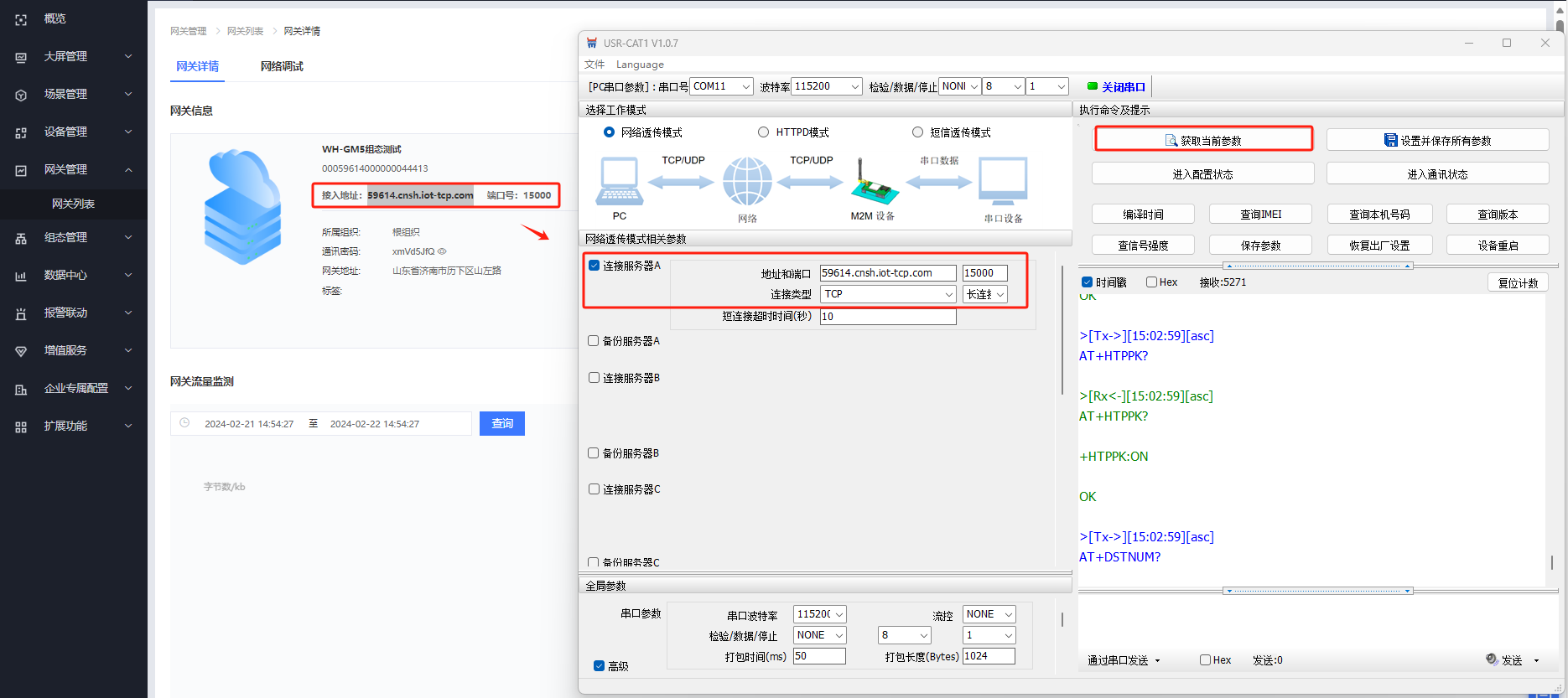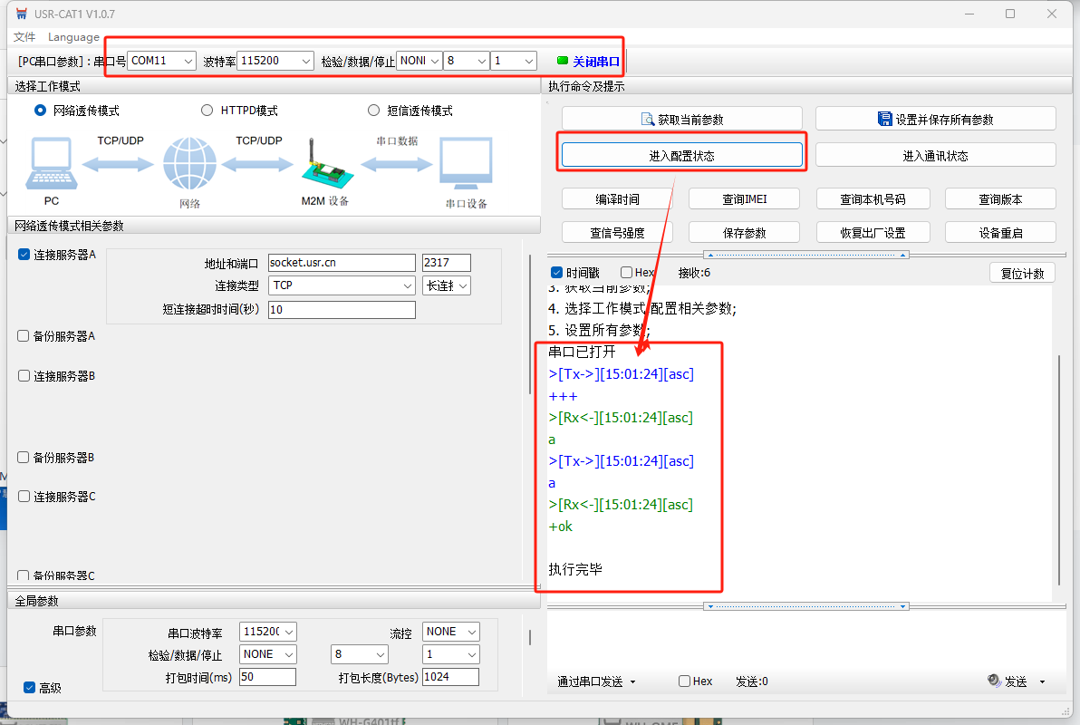 電腦打開USR-CAT1V1.0.7軟件,串口參數選擇115200 N 8 1,COM口選擇COM11,打開串口,點擊進入配置狀態。