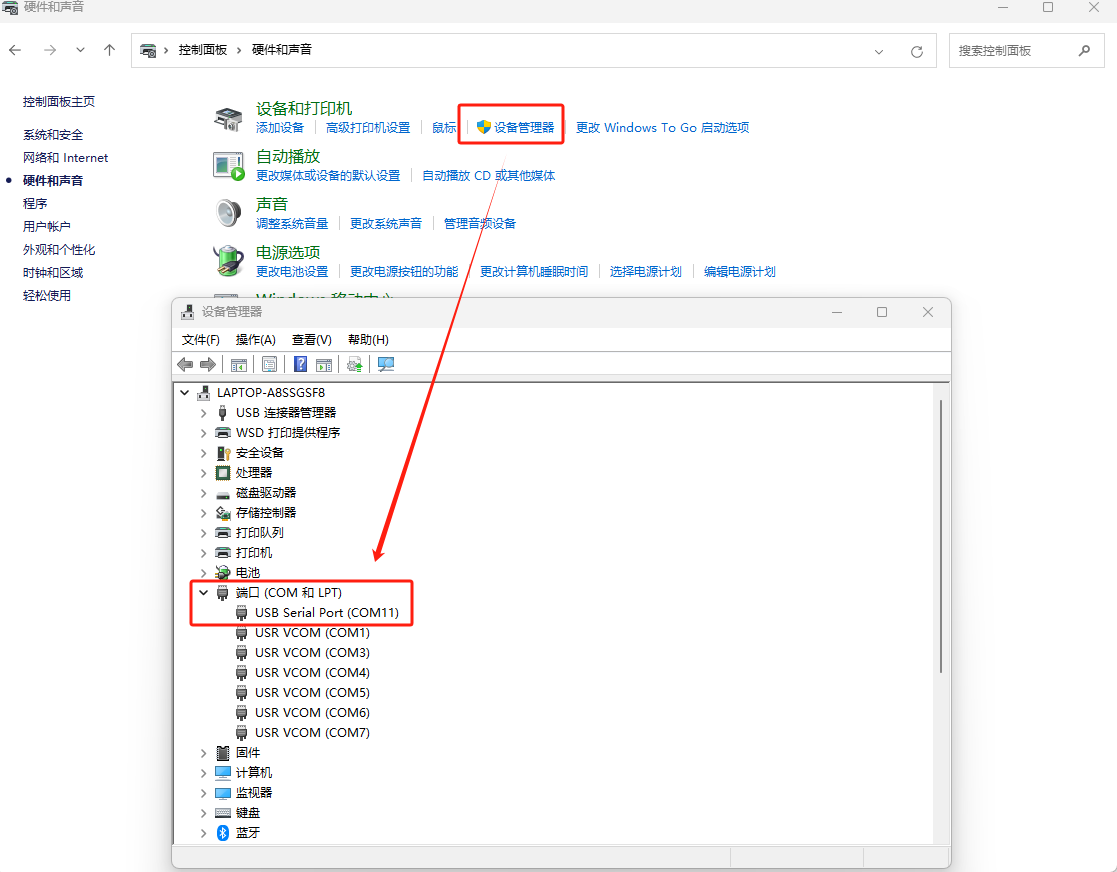 打開控制面板---設備管理器確認USB轉232轉換器COM口為COM11