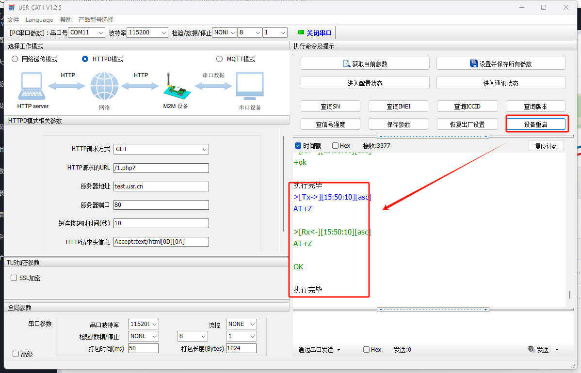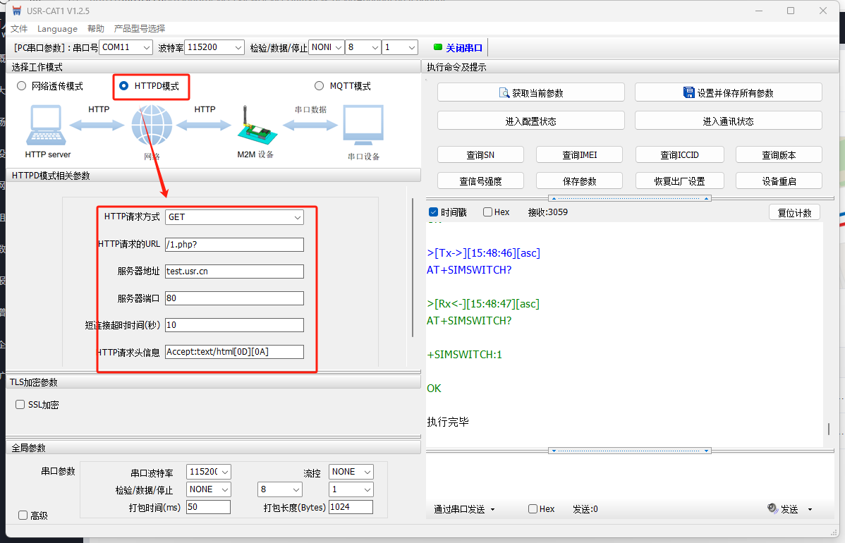 選擇HTTPD模式:請(qǐng)求方式選擇GET,URL:/1php?,服務(wù)器地址:test.usr.cn,服務(wù)器端口80