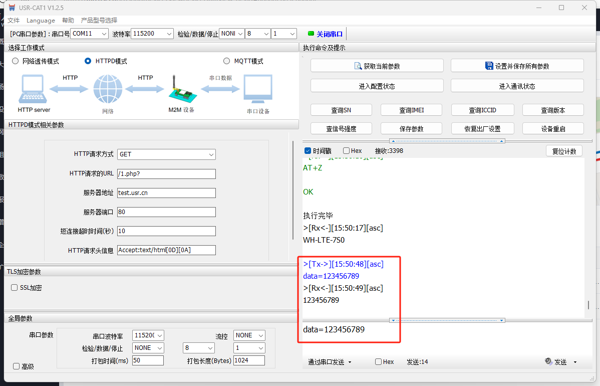 給測試服務(wù)器發(fā)送數(shù)據(jù):data=123456789,測試服務(wù)器收到數(shù)據(jù)并回復(fù)相同數(shù)據(jù)。