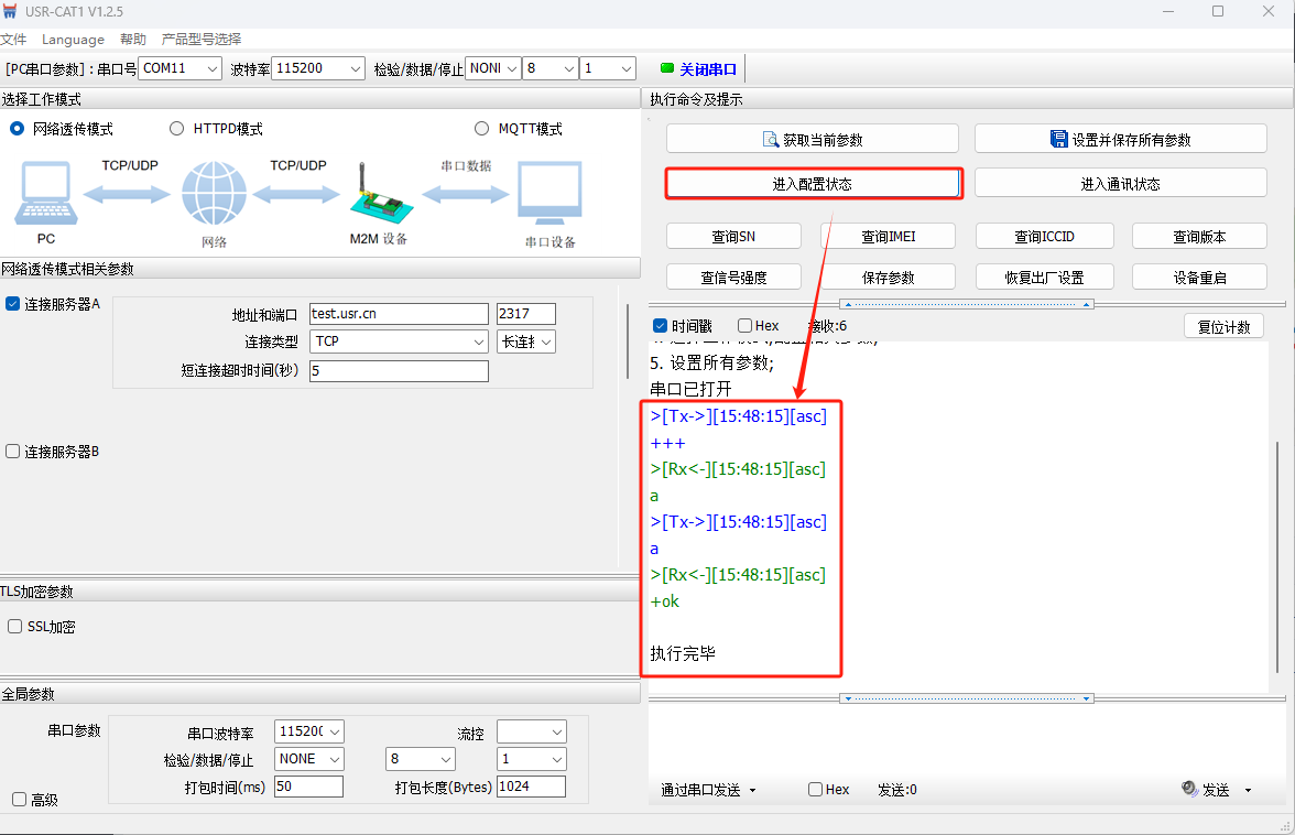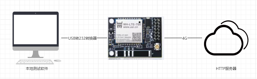 WH-LTE-7S0的底板232串口接USB-RS232串口線到電腦USB口,然后產(chǎn)品接12V電源適配器上電。本例使用有人測試服務(wù)器,測試服務(wù)器發(fā)什么數(shù)據(jù)回復(fù)什么數(shù)據(jù)