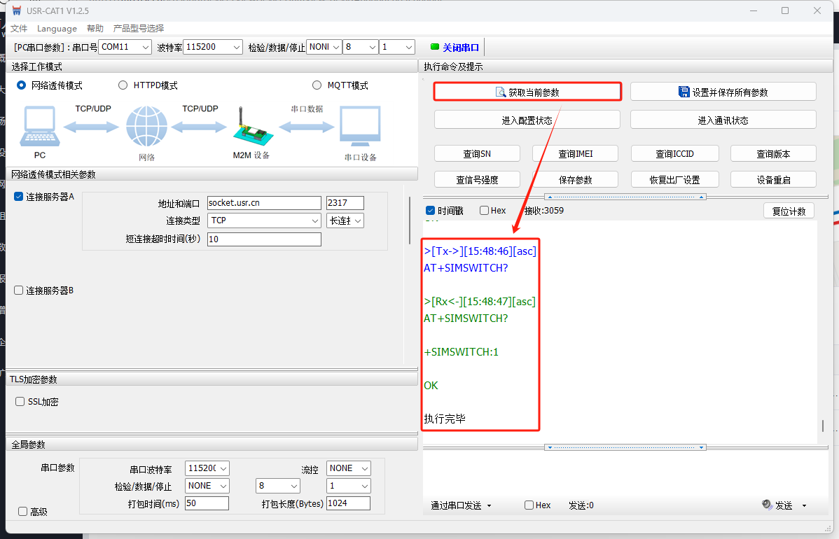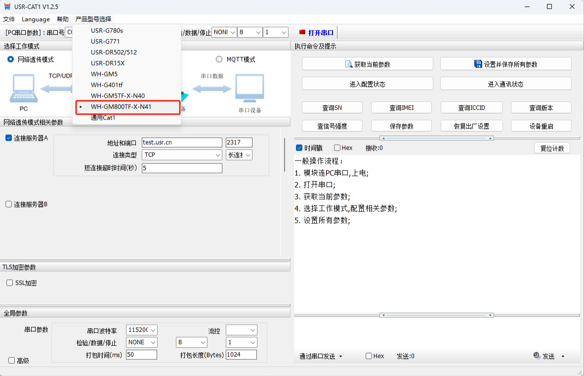 打開WH-LTE-7S0上位機(jī)軟件,型號(hào)選擇WH-GM800TF-X-N41(同7S0 參數(shù)類似) ,COM11,串口參數(shù)選擇115200 NONE 8 1,打開串口。